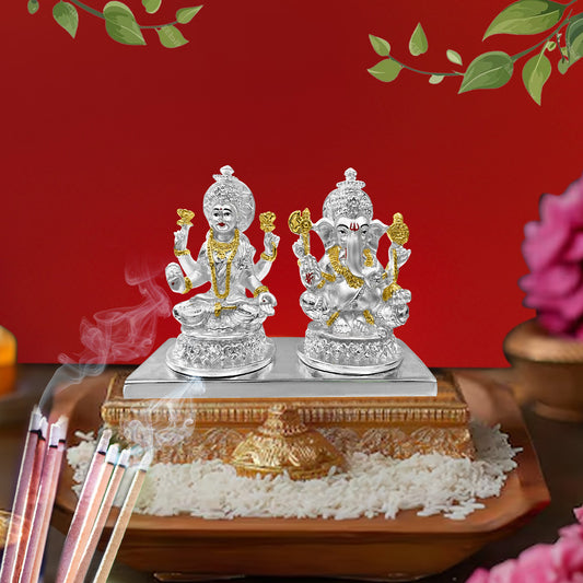Diviniti 999 Silver Laxmi Ganesh Idol Statue Divine Emblem of Prosperity and Good Fortune for Home Office Décor, Tabletop, Puja Room Gift (10x6.5 CM)