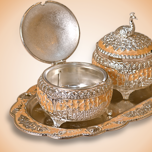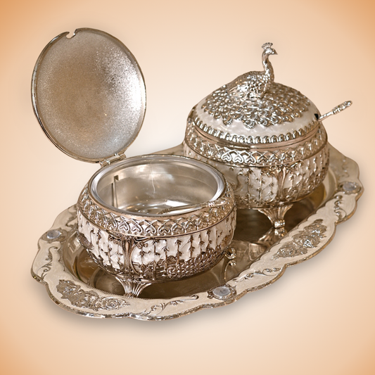 View MoreDiviniti Vintage Silver Plated Dry Fruit Peacock Container Box Set Sugar Bowl with Serving Tray Traditional Parties for Luxury Home Decor, Tabletop & Gift