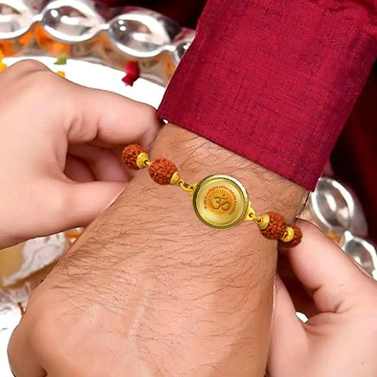 Om with Gayatri Mantra Rudraksha Bracelet with 24K Gold Plated Foil Divine Raksha Bandhan Gift