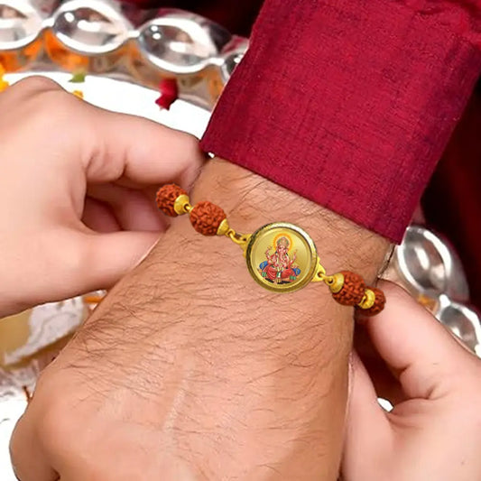 Ganesha Rudraksha Bracelet with 22MM 24K Gold Plated Foil Divine Raksha Bandhan Gift