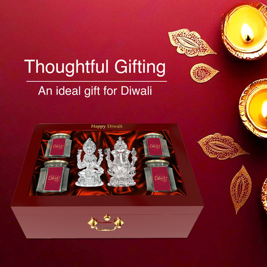 DIVINITI 999 Silver Plated Laxmi Ganesh Idol Statue for Home and Office Décor Puja Room & Luxurious Box Dry Fruits Bottle for Diwali Gift