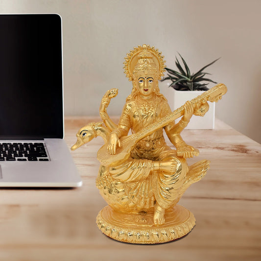 Diviniti 24K Gold Plated Goddess Saraswati Idol Statue Elegant Spiritual Symbol of Wisdom for Home & Office Décor Pooja Room Gift (20.5x18 CM)
