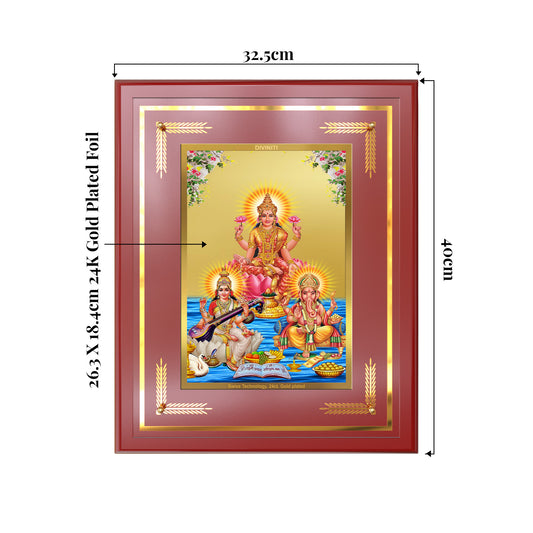 Goddess Lakshmi Saraswati & Lord Ganesha | Divine Trio Wall Mount Photo Frame in 24K Gold Plated Foil