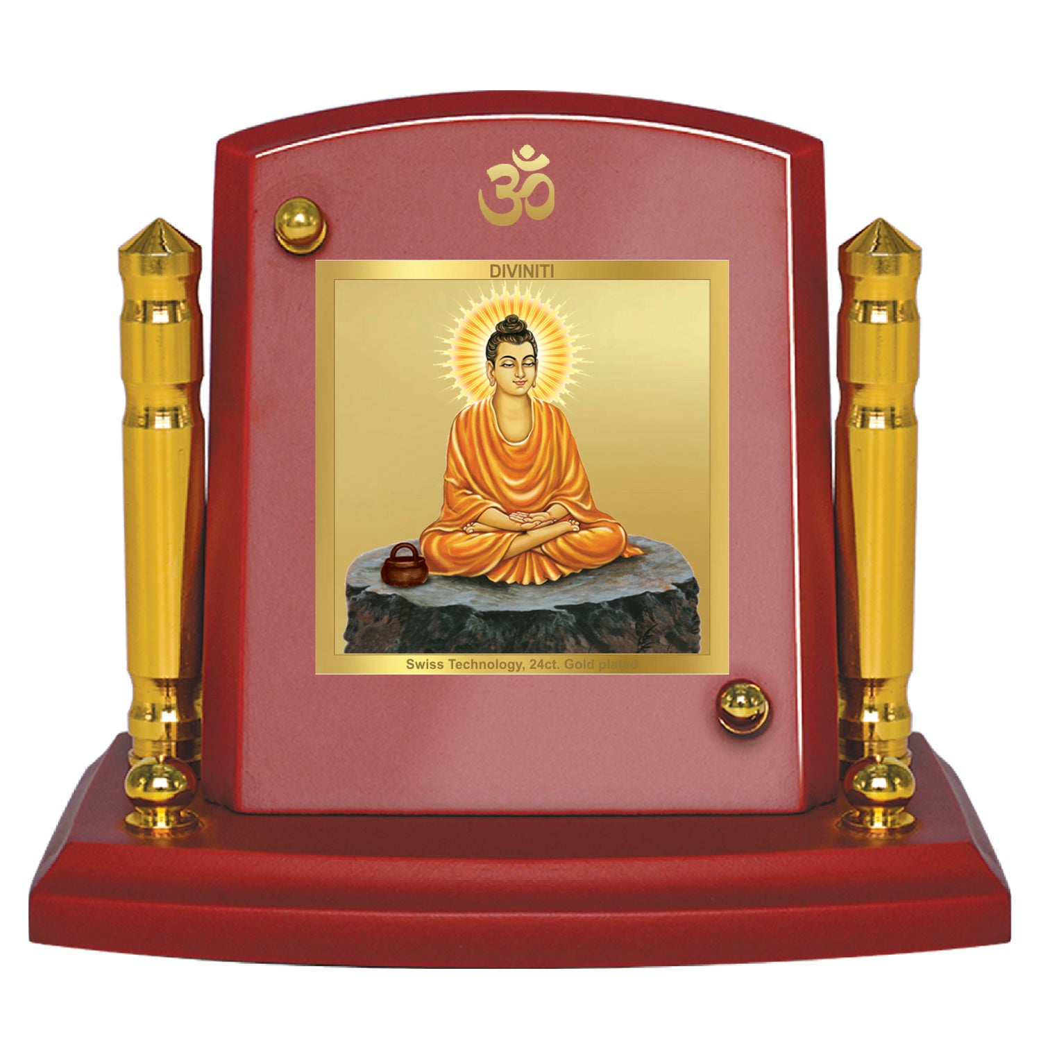 • DIVINITI 24K Gold Plated Pagdi Lord Ganesha statue idol on red base, 7x7 CM, perfect for home decor or luxury gift.