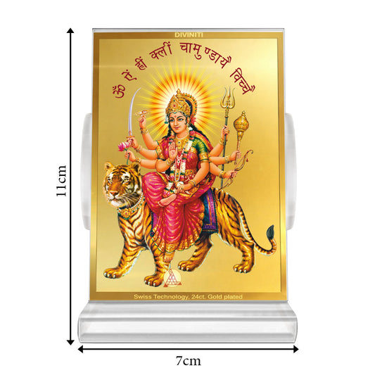 Durga Sherawali Mata with Pind | Divine Goddess Durga Car Dashboard & Tabletop Photo Frame in 24K Gold Plated Foil