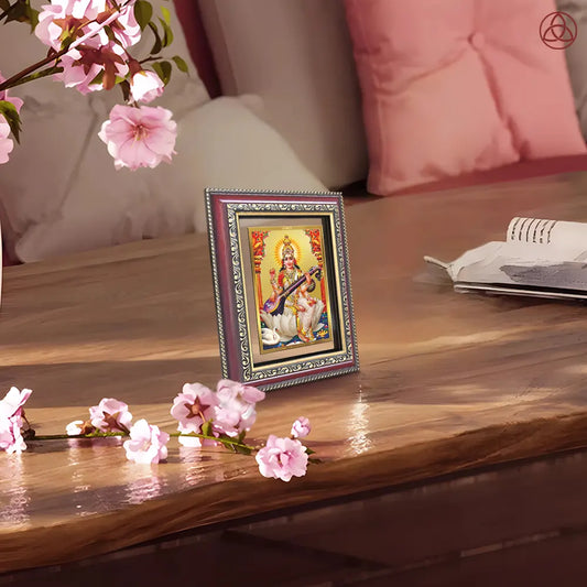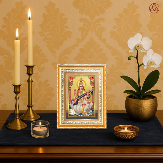 Goddess Saraswati | Divine Mother of Wisdom & Arts Wall & Tabletop Photo Frame in 24K Gold Plated Foil
