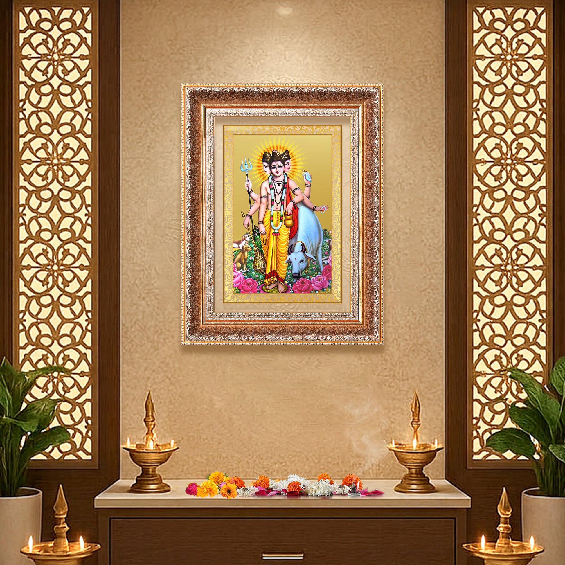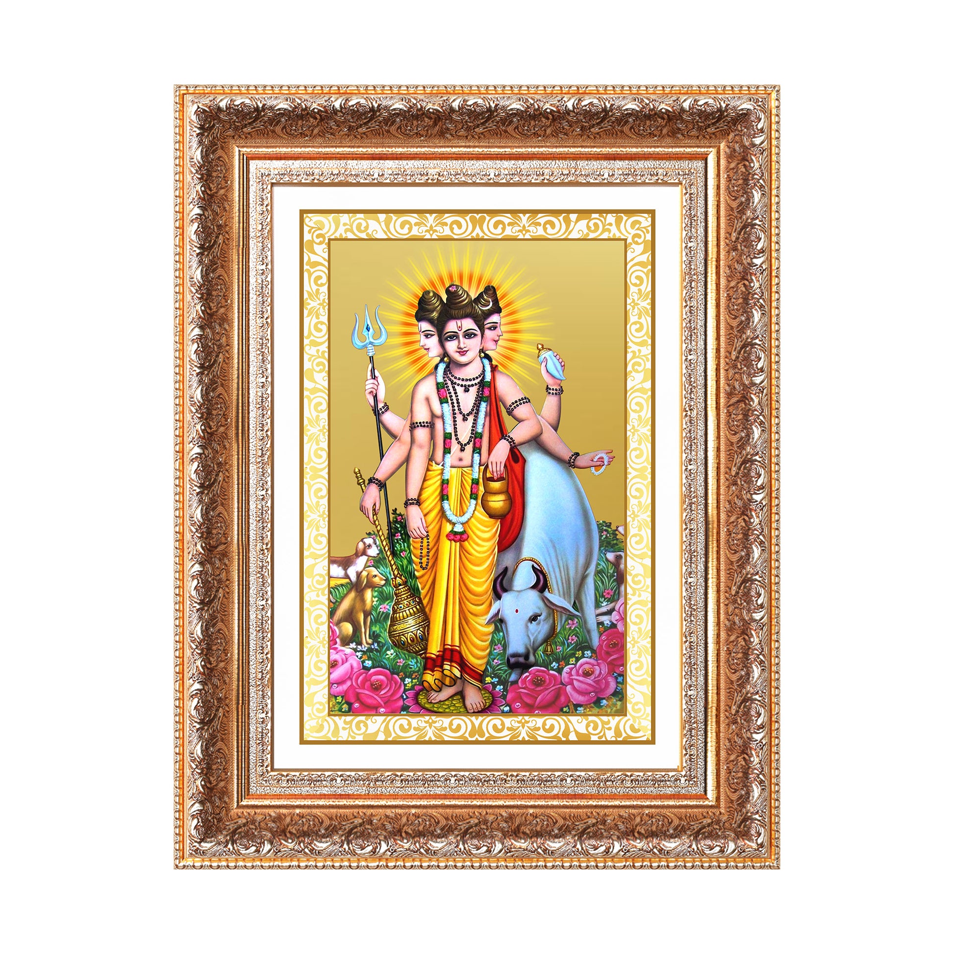 Invoke the serene presence of Shri Dattatreya with this divine Wall Mount Photo Frame featuring Dattatreya with Kamadhenu, crafted in 24K gold-plated foil. Representing the unity of Brahma, Vishnu, and Shiva, Lord Dattatreya is a symbol of supreme wisdom, spiritual guidance, and universal knowledge. The sacred Kamadhenu, the wish-fulfilling divine cow, stands beside him as a symbol of abundance, purity, and nurturing grace.