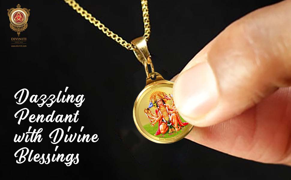 This 24K gold-plated double sided pendant showcases the glory of Lord Panchmukhi Hanuman & Yantra. It is carefully designed using premium quality material with both sides telling a story of art and divinity. The 24 ct. gold gives the pendant a timeless charm, and Swiss technology ensures it lasts. Absolutely safe for skin, the pendant is ideal for every age group be it, men, women and kids. You can wear it every day, adding a touch of sophistication to your style. The divine pendant is a unique piece that connects your style with your spirit. Elegant and spiritually uplifting, this 24K gold pendant will make you feel positive.