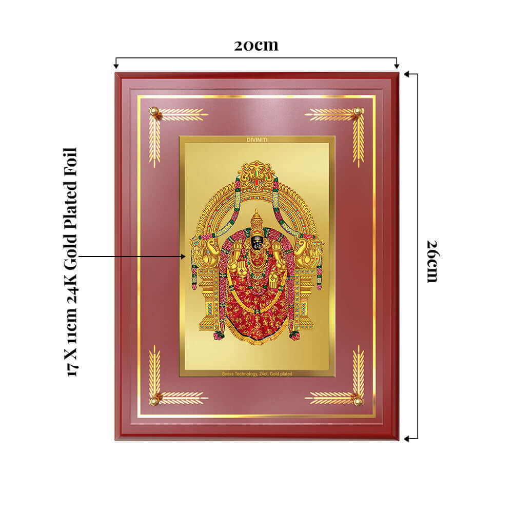 Celebrate the divine grace and auspicious presence of Goddess Padmavati, the beloved consort of Lord Tirupati Balaji (Venkateswara), with this exquisitely crafted 24K gold-plated foil Wall and Tabletop Photo Frame. Revered as an incarnation of Goddess Lakshmi, Padmavati Devi symbolizes wealth, compassion, and prosperity, and is worshipped for her benevolence and fulfillment of wishes.