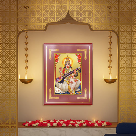 Goddess Saraswati | Divine Mother of Wisdom & Arts Wall Mount Photo Frame in 24K Gold Plated Foil
