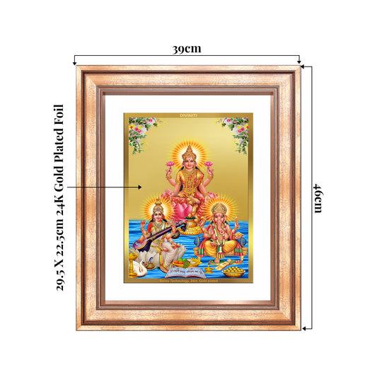 Goddess Lakshmi, Saraswati & Lord Ganesha | Divine Trio Wall Mount Photo Frame in 24K Gold Plated Foil