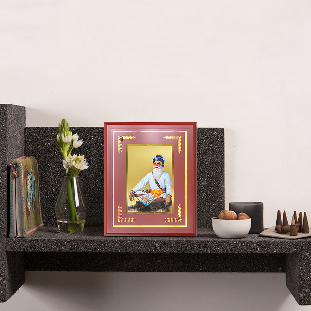 This Eall and Tabletop Photo Frame features the divine image of Baba Deep Singh Ji, symbolizing bravery, selfless service, and courage to endevor the path of righteousness and comitment to the Sikh values, adorned with 24K gold-plated foil, ideal for Sikh homes, gurdwaras, and spaces dedicated to bravery and spiritual commitment to bring divine protection.