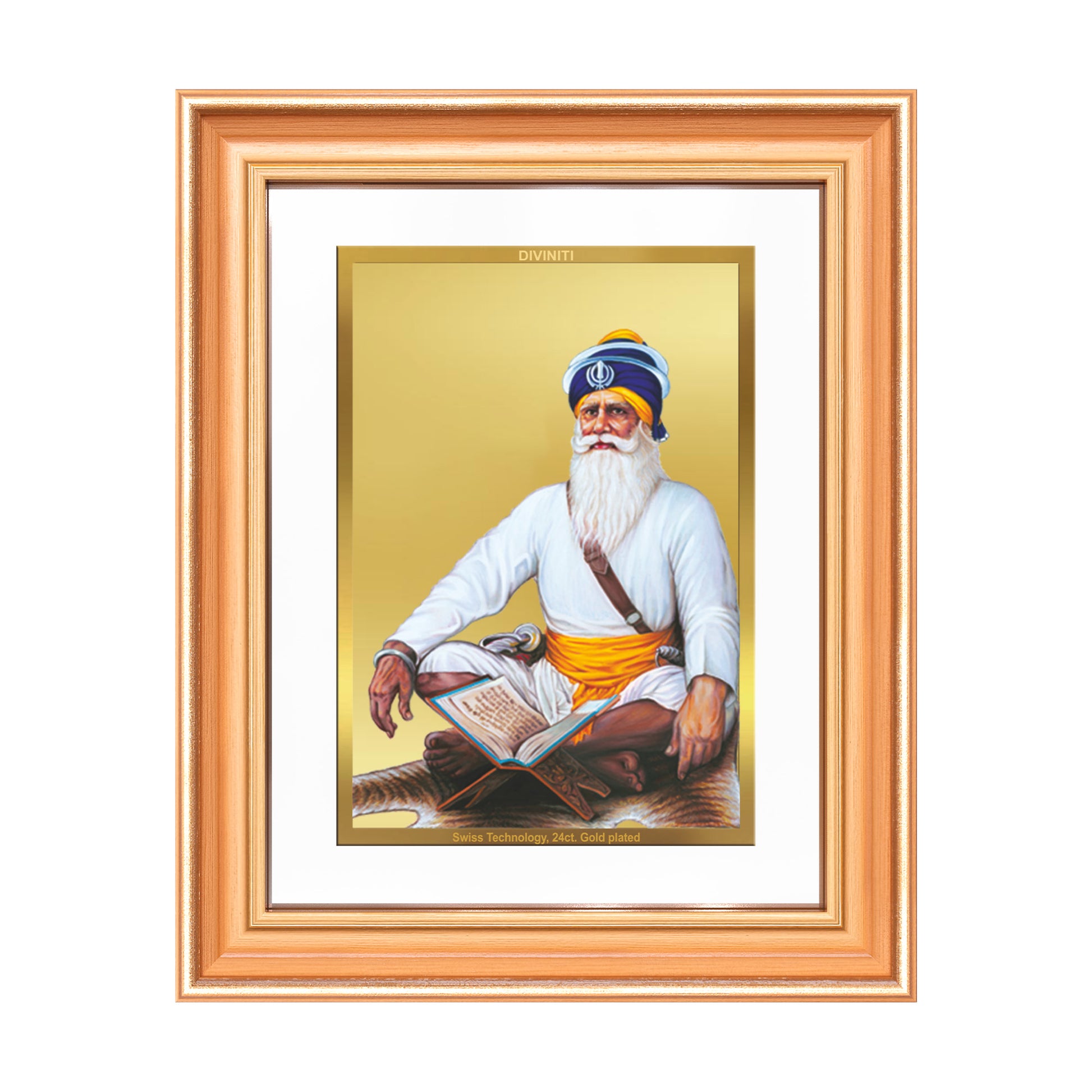 Honor the legacy of strength and unwavering devotion of Baba Deep Singh Ji, a devout disciple of Guru Gobind Singh Ji and the founder of the Shaheed Misl, Baba Deep Singh epitomized courage, faith, and sacrifice known for his heroic defense of the Harmandir Sahib, he fought with unmatched spirit even after being grievously wounded. This Photo Frame features the divine image of Baba Deep Singh Ji, symbolizing bravery, selfless service, and courage to endevor the path of righteousness and comitment to the Sikh values, adorned with 24K gold-plated foil, ideal for Sikh homes, gurdwaras, and spaces dedicated to bravery and spiritual commitment to bring divine protection.
