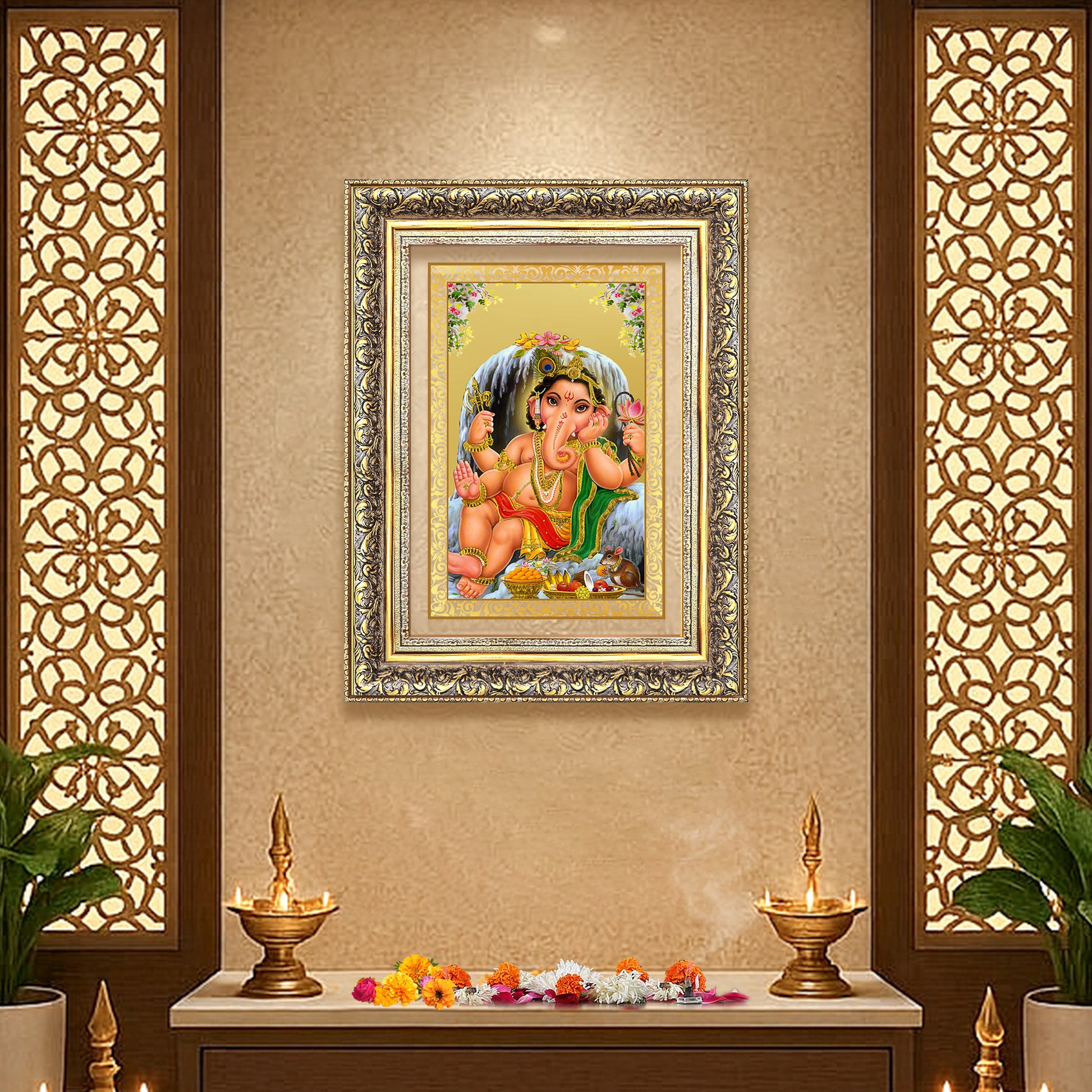 Embrace the blessings of Bal Ganesha, the playful and auspicious form of Lord Ganesha, with this beautifully crafted Lambodara Wall Photo Frame, adorned in radiant 24K gold-plated foil.