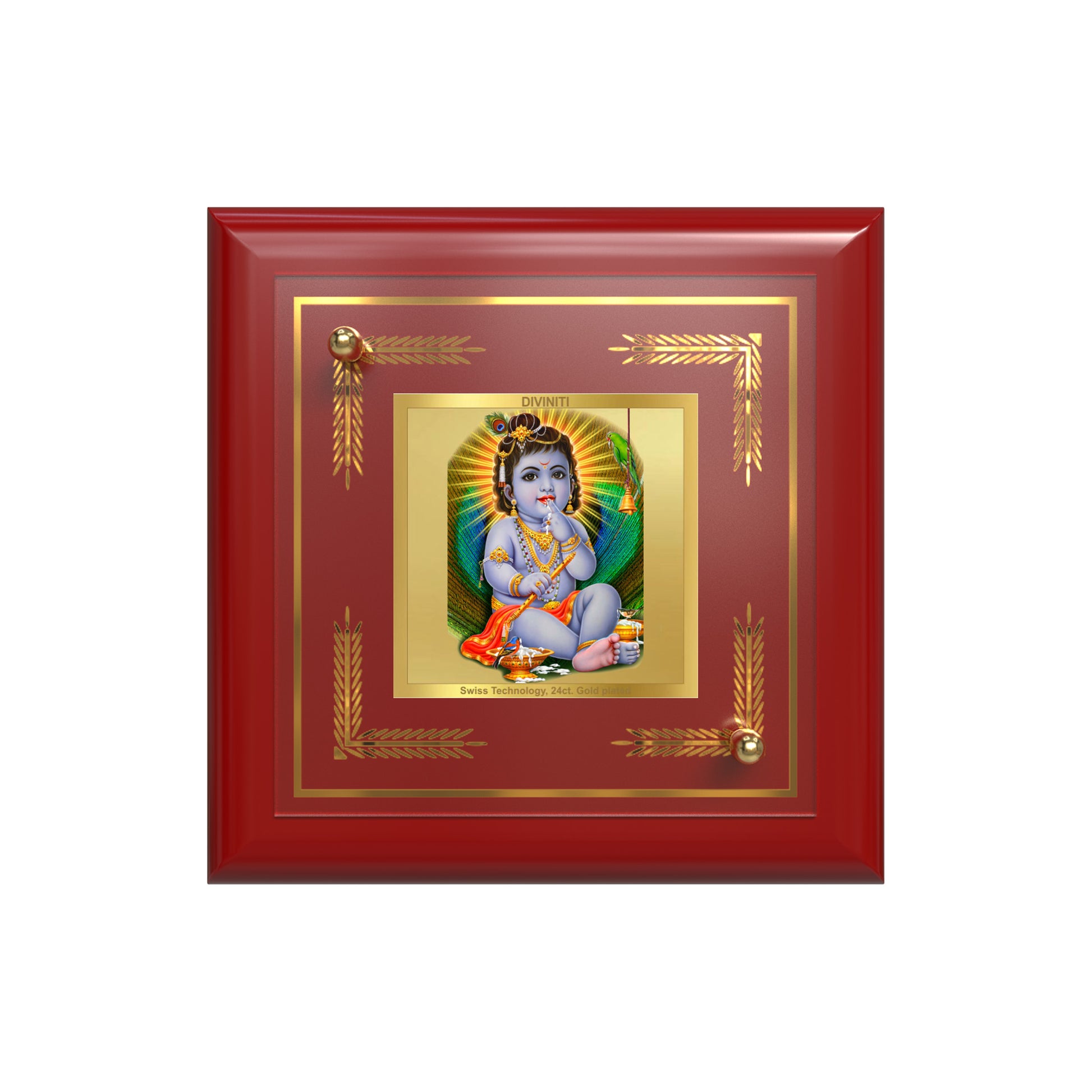 Invoke the divine presence of Bal Gopal with this beautifully crafted 24K Gold Plated Foil Tabletop Frame, ensures exceptional clarity, brilliance, and durability, with intricate detailing using the Swiss Technology capturing krishna's deivine aura. The image depicts young Lord Krishna playfully enjoying makhan (butter) from a Makhan Matka while holding his Baansuri (flute). Set against a vibrant peacock feather background, Krishna's mischievous charm radiates innocence and divine joy. A parrot perched on a ghanti (bell) adds to the blissful atmosphere.