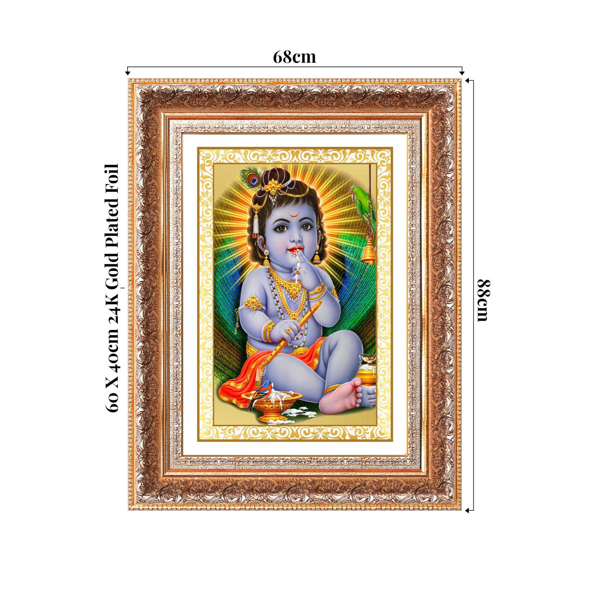 Invoke the divine presence of Bal Gopal with this beautifully crafted 24K Gold Plated Foil Wall Photo Frame, ensures exceptional clarity, brilliance, and durability, with intricate detailing using the Swiss Technology capturing krishna's deivine aura. The image depicts young Lord Krishna playfully enjoying makhan (butter) from a Makhan Matka while holding his Baansuri (flute). Set against a vibrant peacock feather background, Krishna's mischievous charm radiates innocence and divine joy. A parrot perched on a ghanti (bell) adds to the blissful atmosphere.