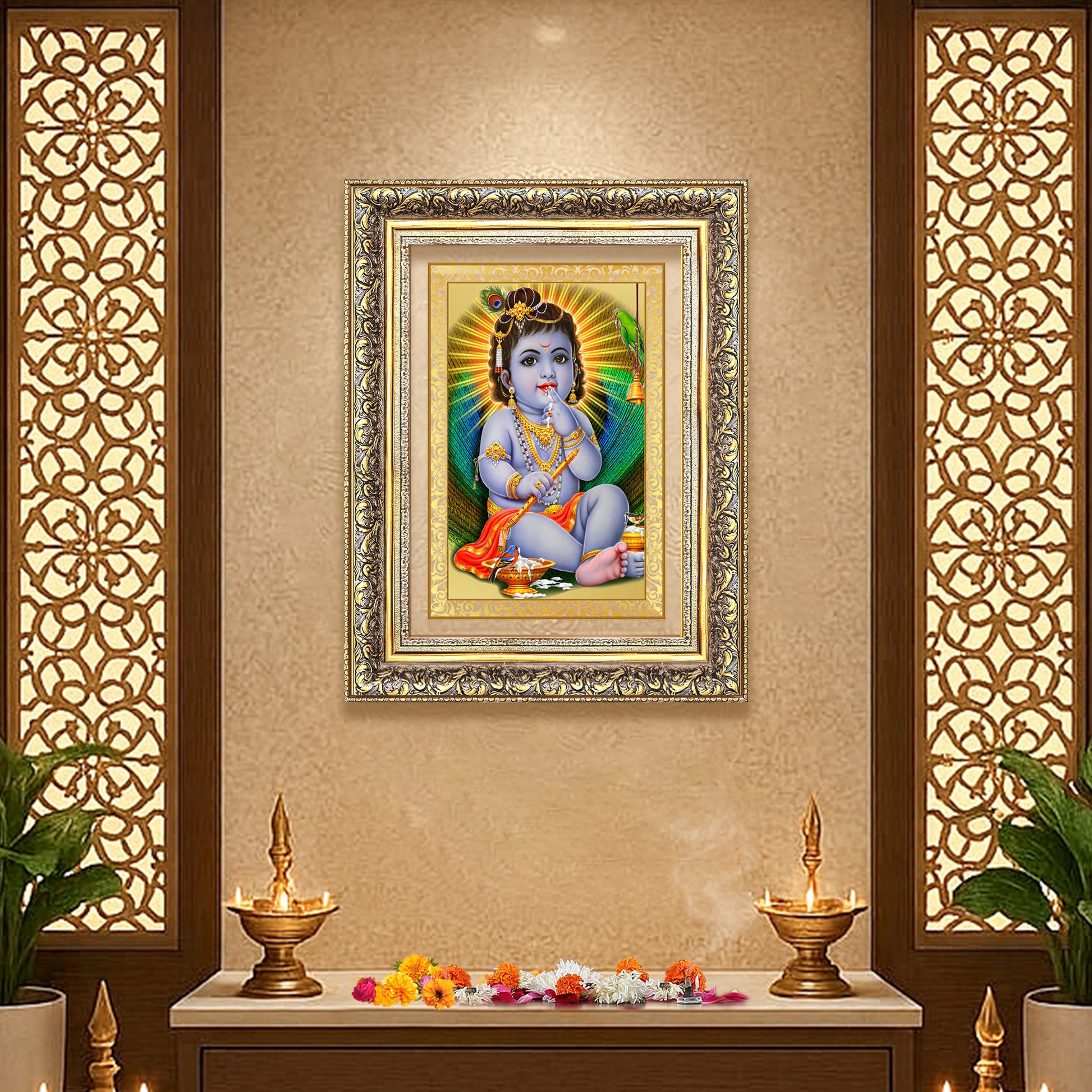 Invoke the divine presence of Bal Gopal with this beautifully crafted 24K Gold Plated Foil Wall Photo Frame, ensures exceptional clarity, brilliance, and durability, with intricate detailing using the Swiss Technology capturing krishna's deivine aura. The image depicts young Lord Krishna playfully enjoying makhan (butter) from a Makhan Matka while holding his Baansuri (flute). Set against a vibrant peacock feather background, Krishna's mischievous charm radiates innocence and divine joy. A parrot perched on a ghanti (bell) adds to the blissful atmosphere.