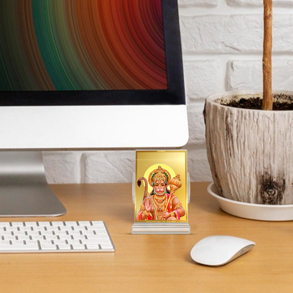 This Hanuman frame serves as an exquisite addition to your car dashboard, home, table, office, shop or showroom. You can also use it in your Puja Prayer room to create a serene and sacred atmosphere. Made from acrylic material and adorned with 24K gold-plated foil, this divine frame is crafted to withstand the test of time, ensuring long-lasting spark and durability.