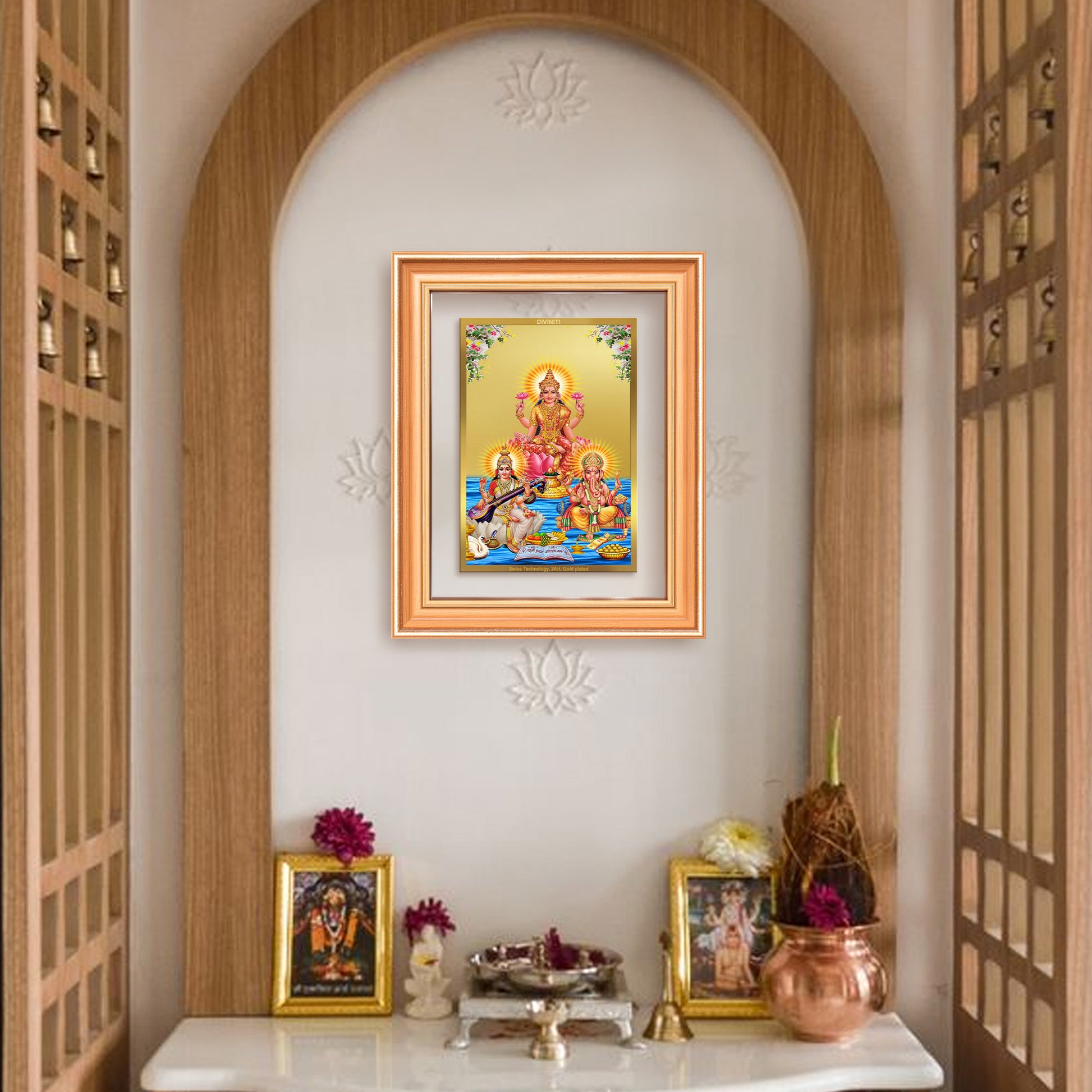 Goddess Lakshmi, the bestower of wealth and abundance; Goddess Saraswati, the embodiment of knowledge and the arts; and Lord Ganesha, the remover of obstacles and lord of new beginnings come together in this radiant Photo Frame to bless your home and heart. Crafted with Swiss embossing technology for intricate precision and a rich gold finish, this Photo Frame is a symbol of perfect harmony and grace. The 24K gold plating ensures enduring brilliance, making it ideal for pooja rooms, workspaces, or as a cherished gift for new ventures and festive occasions.
