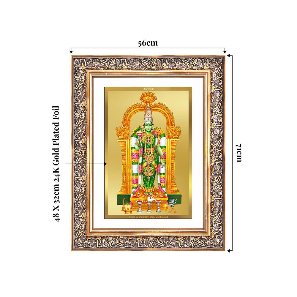 Celebrate the divine strength and grace of Goddess Meenakshi, the presiding deity of Madurai, with this exquisite Wall Photo Frame crafted in 24K gold-plated foil. Revered as an incarnation of Goddess Parvati, Meenakshi Devi symbolizes feminine power, wisdom, and righteous rule, known for her valour, compassion, and celestial beauty.