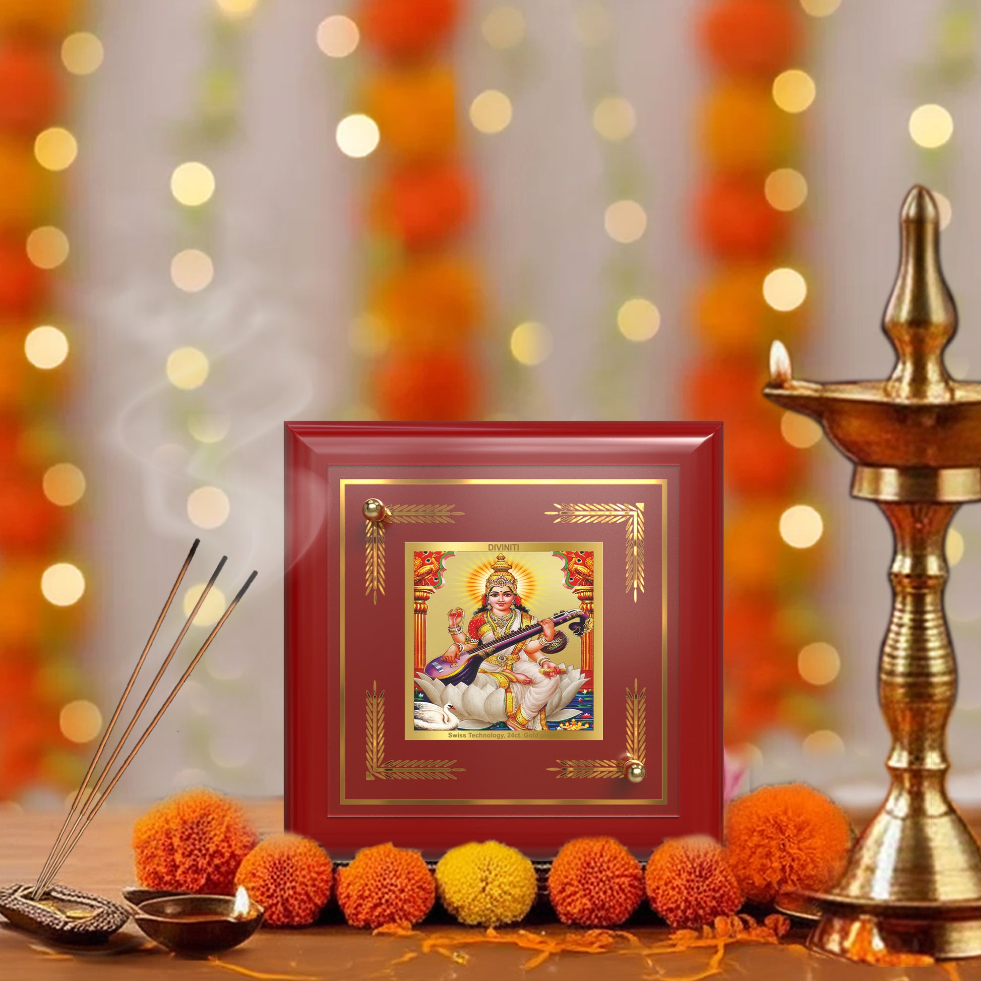 Goddess Saraswati | Divine Mother of Wisdom & Arts Tabletop Frame in 24K Gold Plated Foil