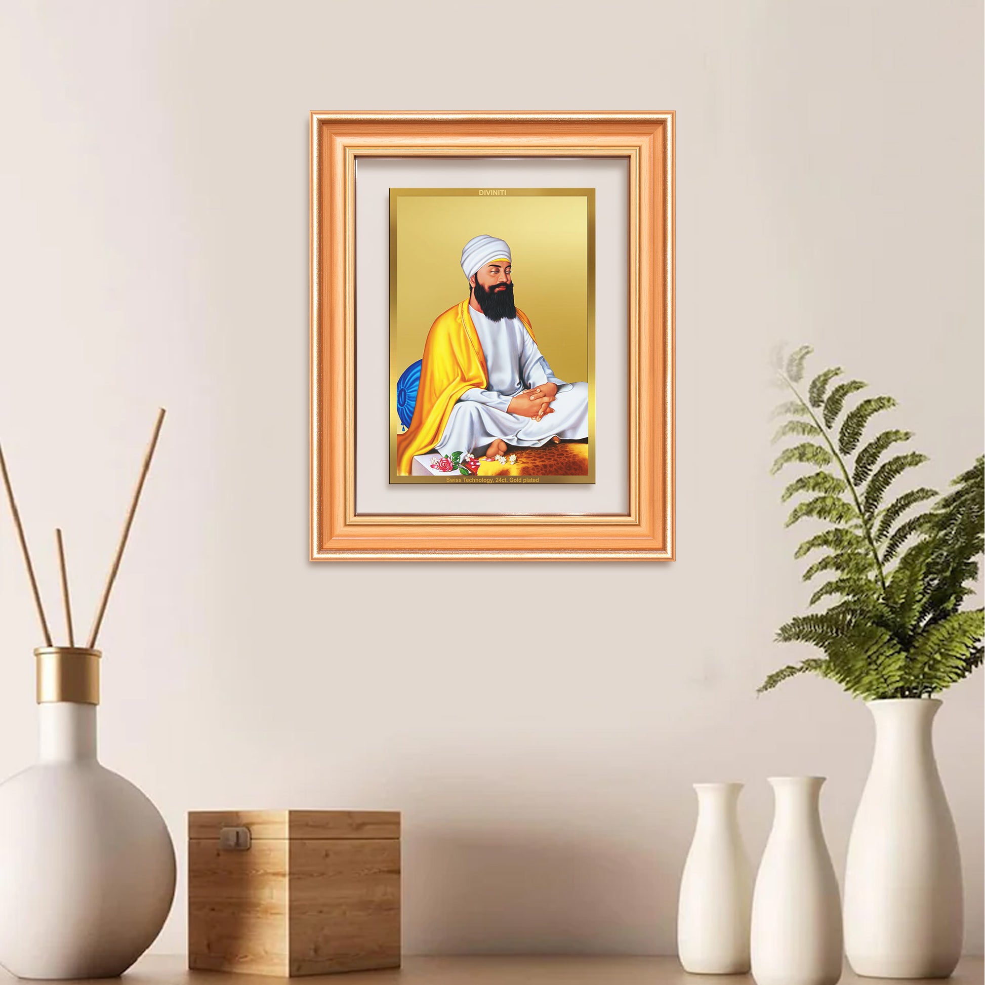 Bring home the spiritual presence of Guru Tegh Bahadar Sahib Ji with this exquisite 24K gold-plated foil Wall Mount Photo Frame. Revered as the ninth Guru of Sikhism, Guru Tegh Bahadar Ji is remembered as the Hind di Chadar—the protector of faith, known for his supreme sacrifice, courage, and deep spiritual wisdom.