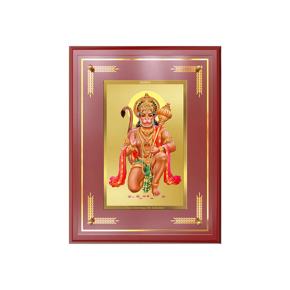 This spiritually uplifting frame captures Lord Hanuman radiating divine energy with one hand raised in blessing and the other holding his sacred mace (gada), a symbol of divine power and victory. Meticulously crafted using advanced Swiss embossing technology, the intricate details and radiant 24K gold finish reflect exceptional artistry and reverence. Ideal for your pooja room, entrance, or workspace, this frame serves as a powerful reminder of divine protection, discipline, and spiritual devotion.