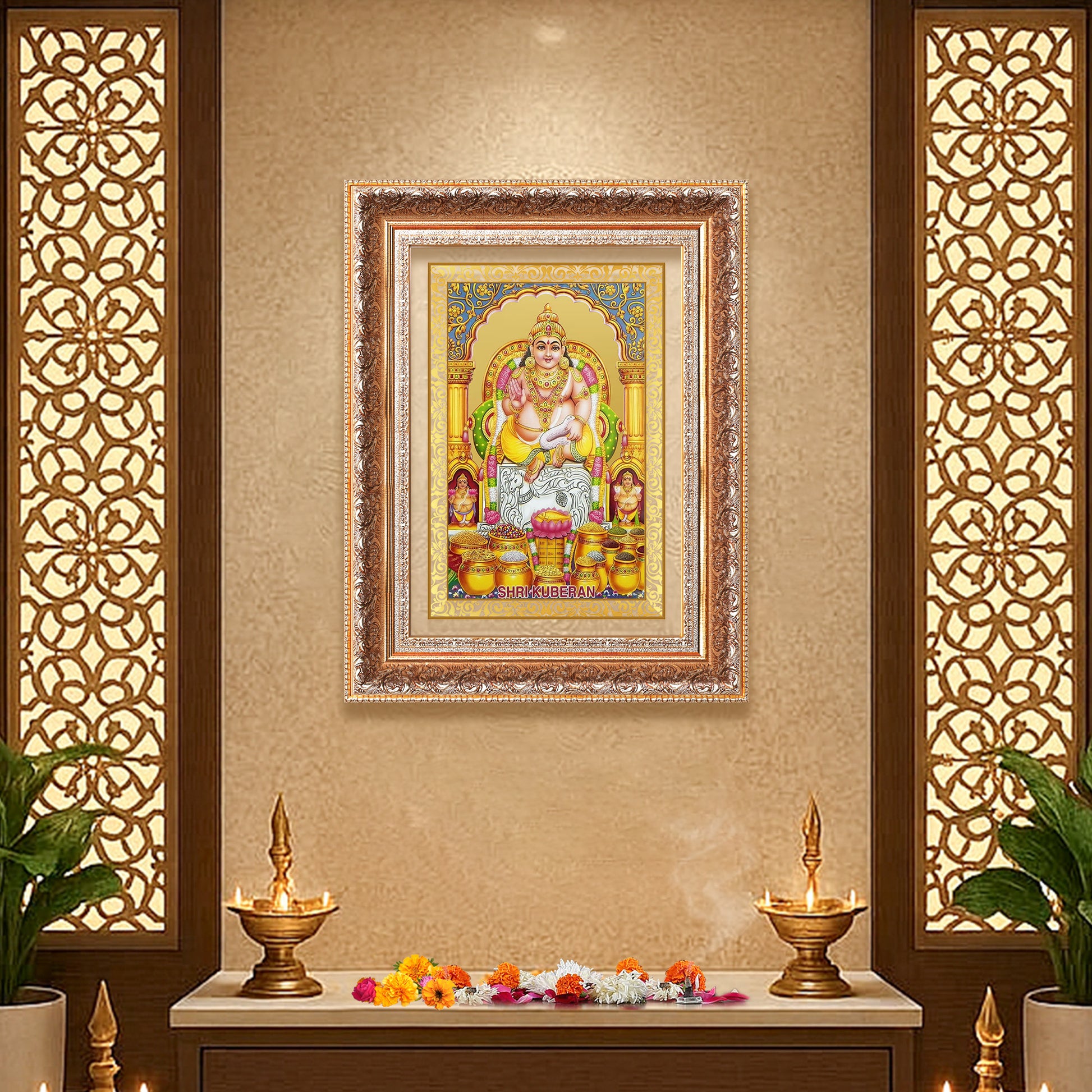 Invoke the blessings of Lord Kuber, the celestial treasurer and guardian of wealth, with this auspicious Wall Photo Frame beautifully crafted in 24K gold-plated foil. Revered in Vedic tradition as the divine custodian of prosperity and abundance, Lord Kuber is believed to bless his devotees with material success, stability, and fortune when worshipped with devotion.