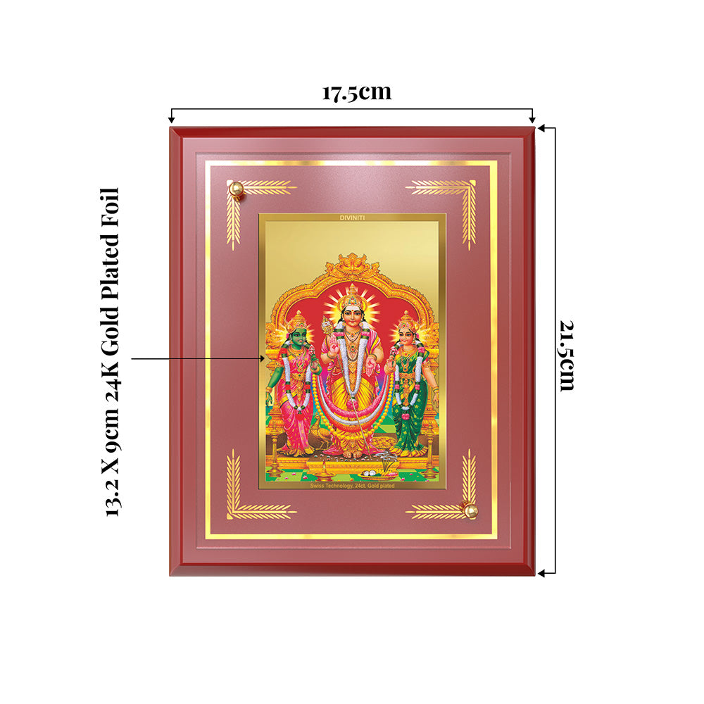 Celebrate the sacred union of Lord Murugan and Goddess Valli with this beautifully crafted Wall and Tabletop Photo Frame in 24K gold-plated foil. Revered as the divine warrior and embodiment of wisdom and victory, Lord Murugan stands gracefully beside Valli, his beloved consort and symbol of devotion and love.