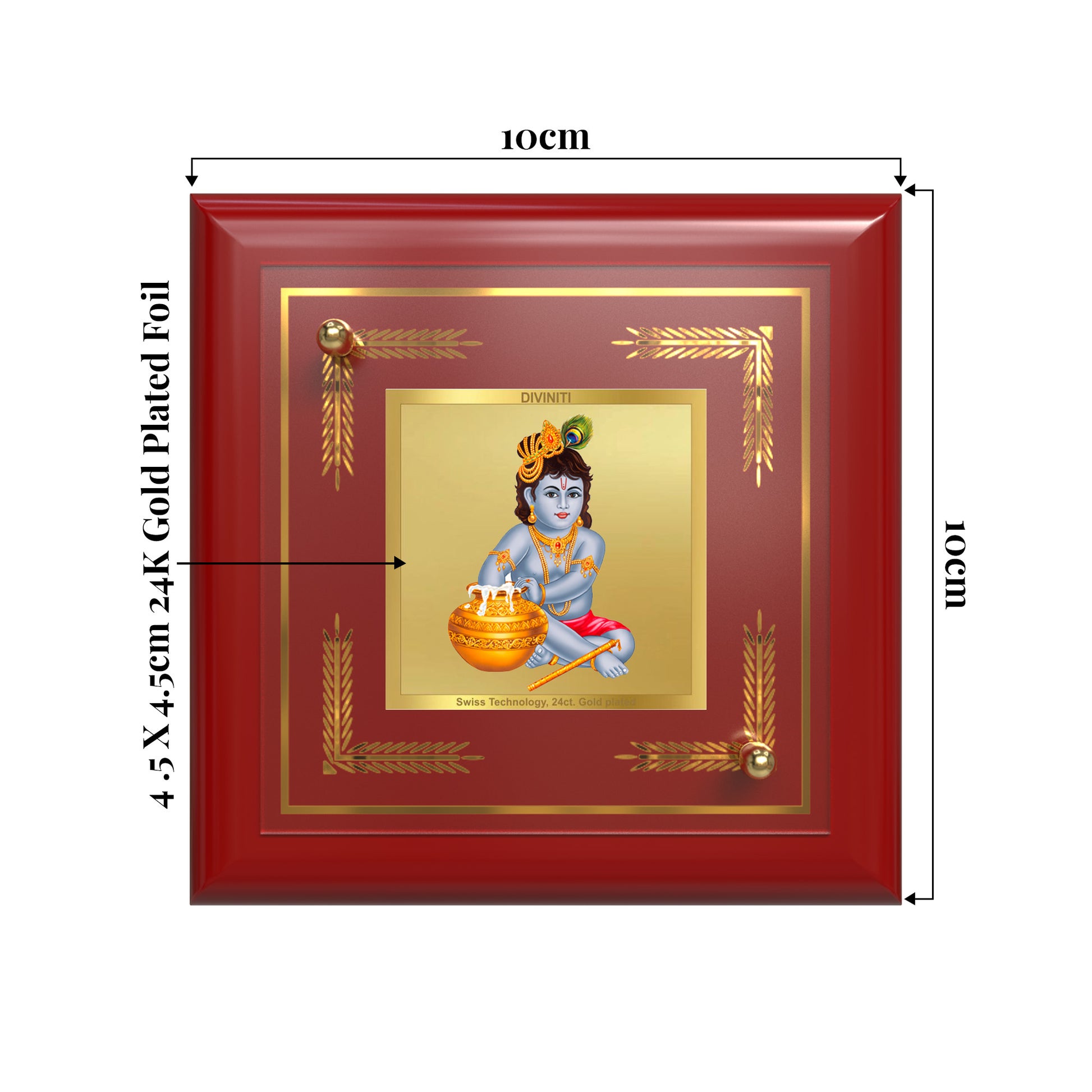 Invoke the divine presence of Bal Gopal with this beautifully crafted 24K Gold Plated Foil Tabletop Frame, ensures exceptional clarity, brilliance, and durability, with intricate detailing using the Swiss Technology capturing krishna's deivine aura. The image depicts young Lord Krishna playfully enjoying makhan (butter) from a Makhan Matka while holding his Baansuri (flute). Set against a vibrant peacock feather background, Krishna's mischievous charm radiates innocence and divine joy. A parrot perched on a ghanti (bell) adds to the blissful atmosphere.