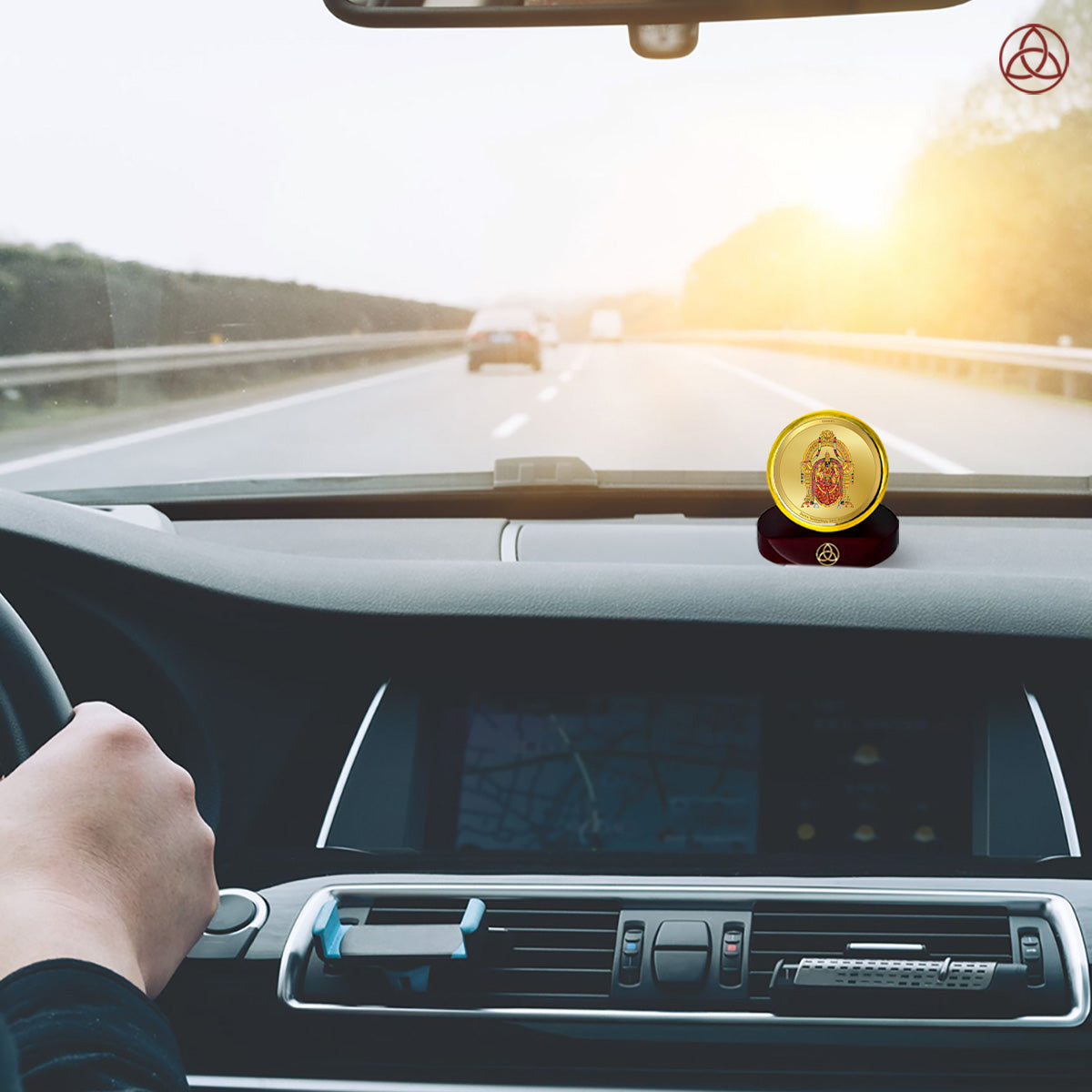 The frame features a beautifully crafted 24K gold-plated image of Goddess Padmavathi, radiating divine energy, serenity, and blessings. Mounted on a durable and elegant frame, its compact size makes it perfect for both your car dashboard and as a sacred display in your home or office.