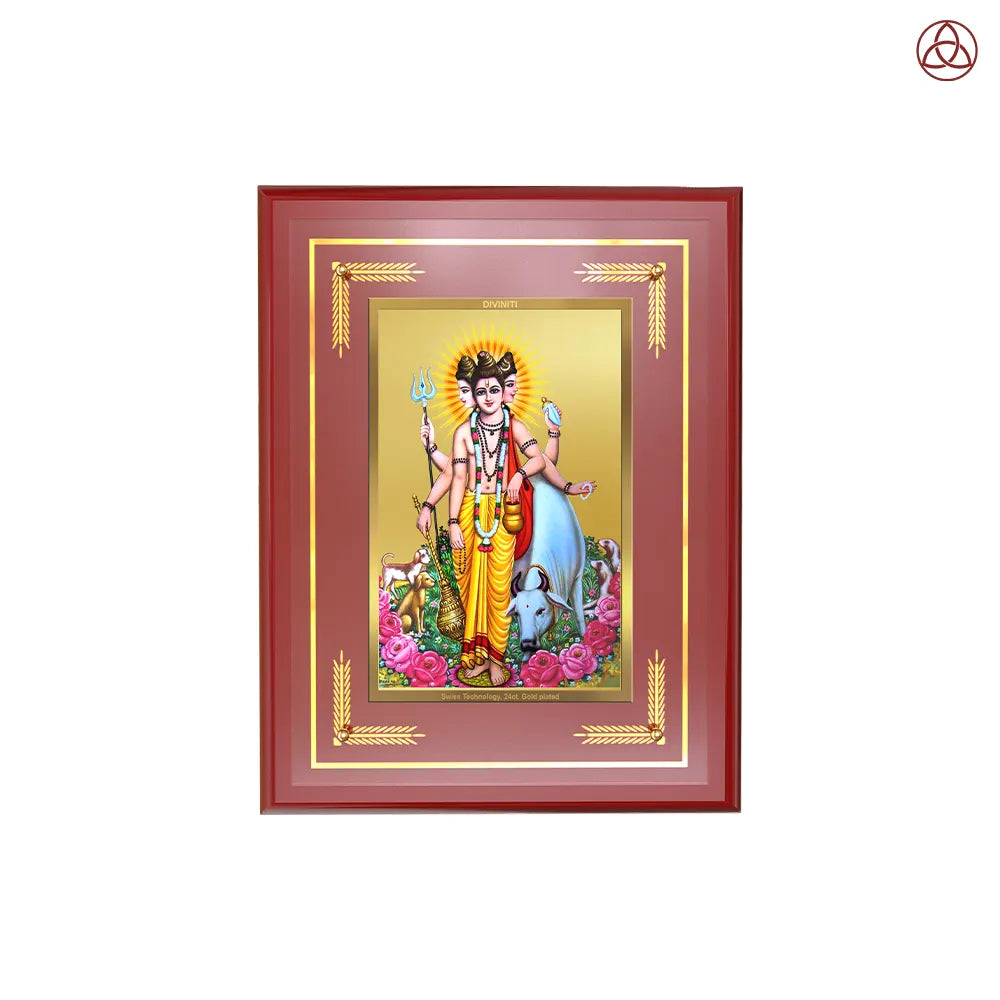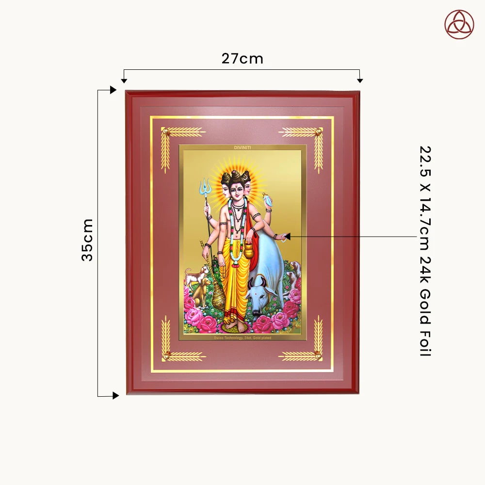 Invoke the serene presence of Shri Dattatreya with this divine Wall Photo Frame featuring Dattatreya with Kamadhenu, crafted in 24K gold-plated foil. Representing the unity of Brahma, Vishnu, and Shiva, Lord Dattatreya is a symbol of supreme wisdom, spiritual guidance, and universal knowledge. The sacred Kamadhenu, the wish-fulfilling divine cow, stands beside him as a symbol of abundance, purity, and nurturing grace.