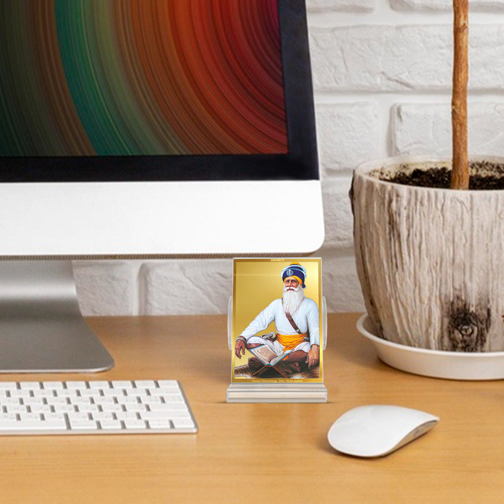Honor the legacy of strength and unwavering devotion of Baba Deep Singh Ji, a devout disciple of Guru Gobind Singh Ji and the founder of the Shaheed Misl, Baba Deep Singh epitomized courage, faith, and sacrifice known for his heroic defense of the Harmandir Sahib, he fought with unmatched spirit even after being grievously wounded. This frame features the divine image of Baba Deep Singh Ji, symbolizing bravery, selfless service, and courage to endevor the path of righteousness and comitment to the Sikh values, adorned with 24K gold-plated foil, ideal for Sikh homes, gurdwaras, and spaces dedicated to bravery and spiritual commitment to bring divine protection.