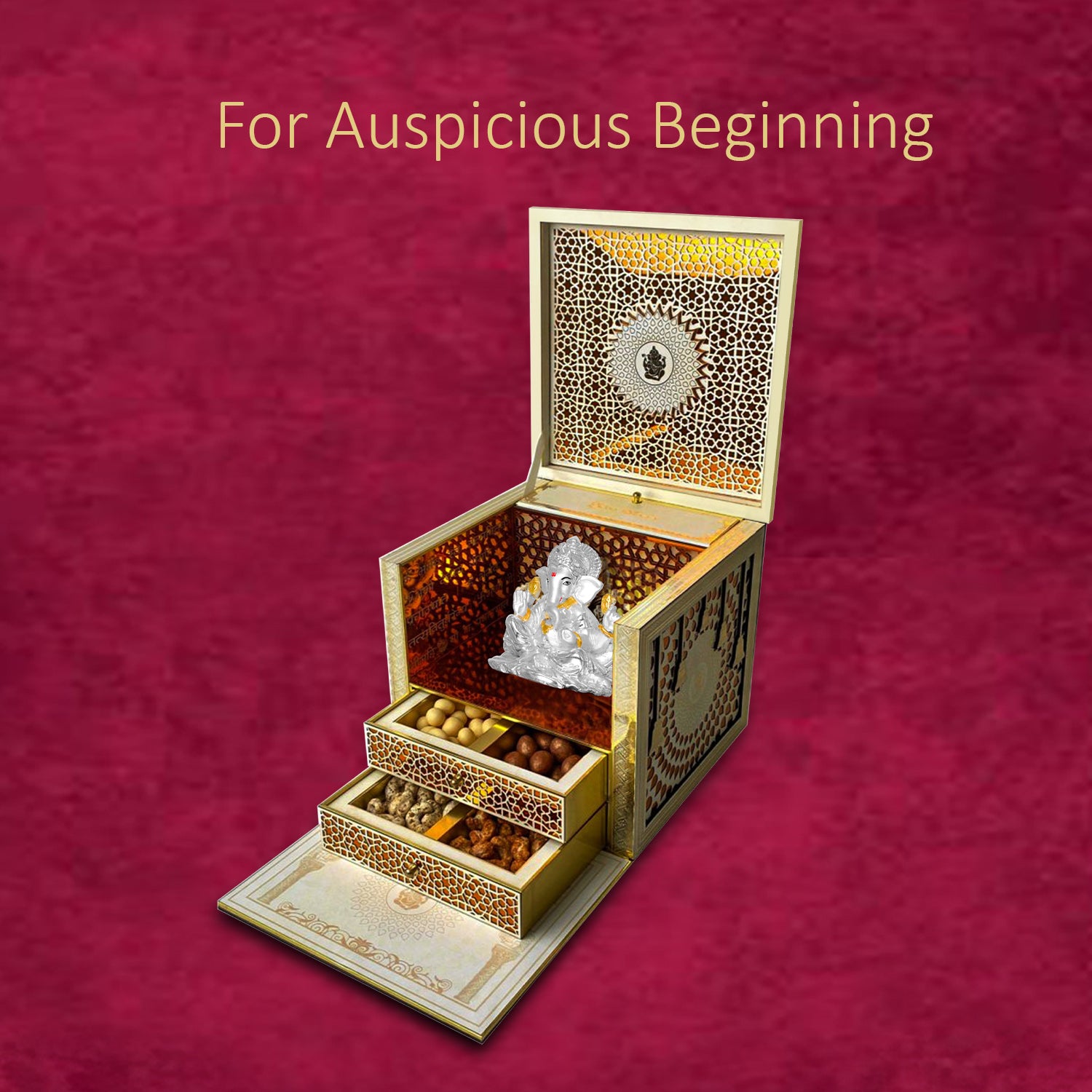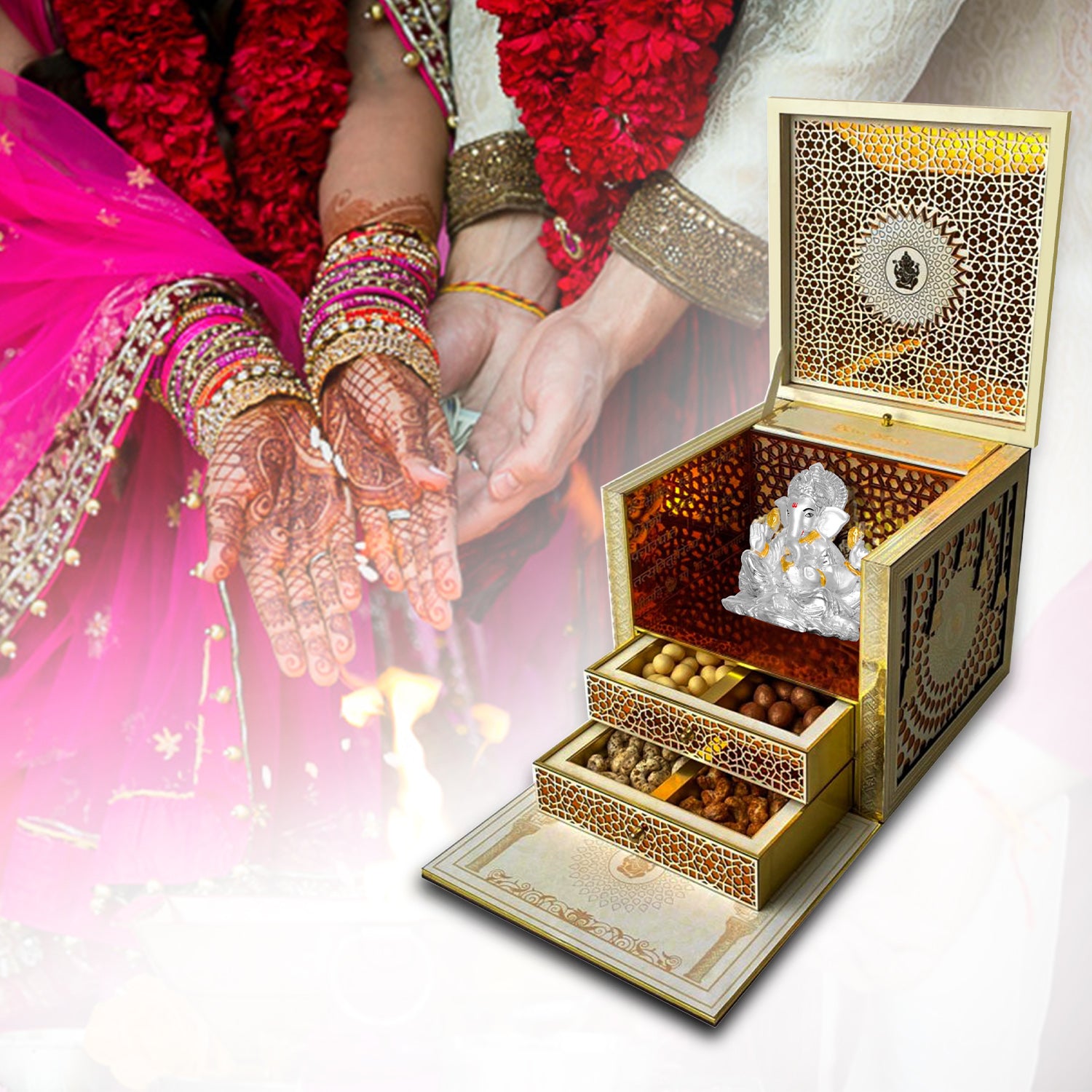 Elevate your wedding announcement to a divine level with our Designer wedding card gift. This exquisitely designed invitation is a testament to the sacredness of your union. The cover, adorned with intricate patterns, sets the stage for the unfolding of a beautiful love story. What sets this wedding card apart is the inclusion of a 999 Silver Plated Ganesha idol nestled inside, a symbol of wisdom, prosperity, and the remover of obstacles.