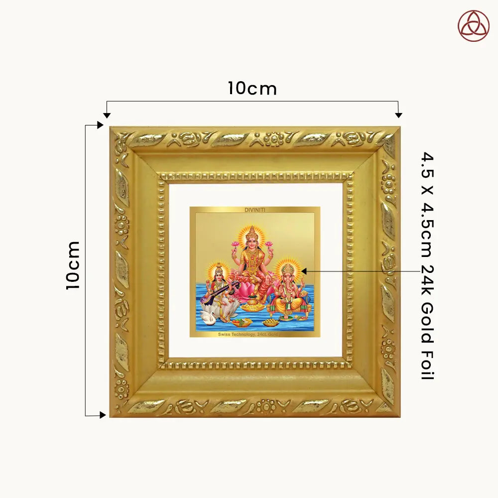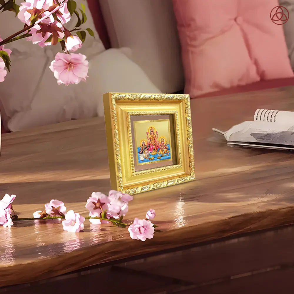 Goddess Lakshmi, the bestower of wealth and abundance; Goddess Saraswati, the embodiment of knowledge and the arts; and Lord Ganesha, the remover of obstacles and lord of new beginnings come together in this radiant frame to bless your home and heart. Crafted with Swiss embossing technology for intricate precision and a rich gold finish, this frame is a symbol of perfect harmony and grace. The 24K gold plating ensures enduring brilliance, making it ideal for pooja rooms, workspaces, or as a cherished gift for new ventures and festive occasions.