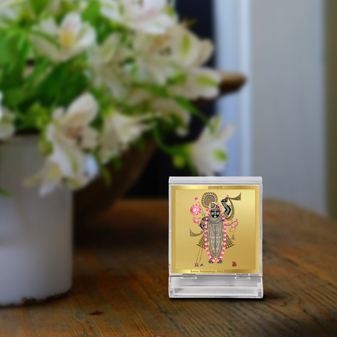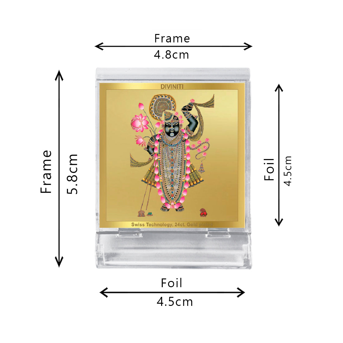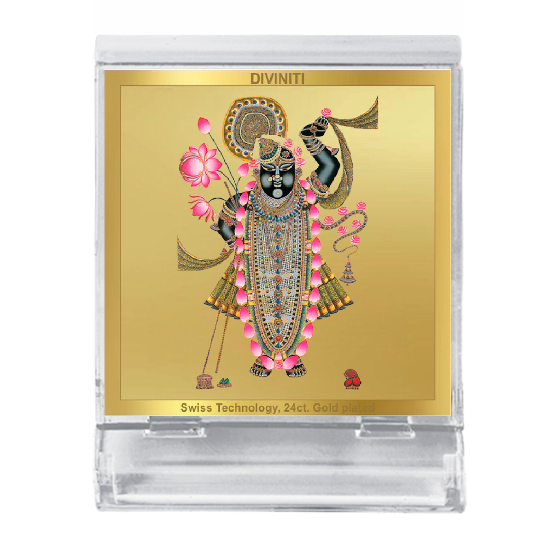 The Diviniti 24K Gold Plated Acrylic Frame is an exquisite spiritual and decorative piece that enhances any space with its divine elegance. This beautiful frame features a high-quality image, inscribed with 24K gold plating on a durable acrylic base. With dimensions of 5.8x4.8 cm, it is perfectly sized for car dashboards, tabletops, puja rooms, or any area that requires a touch of divine grace.