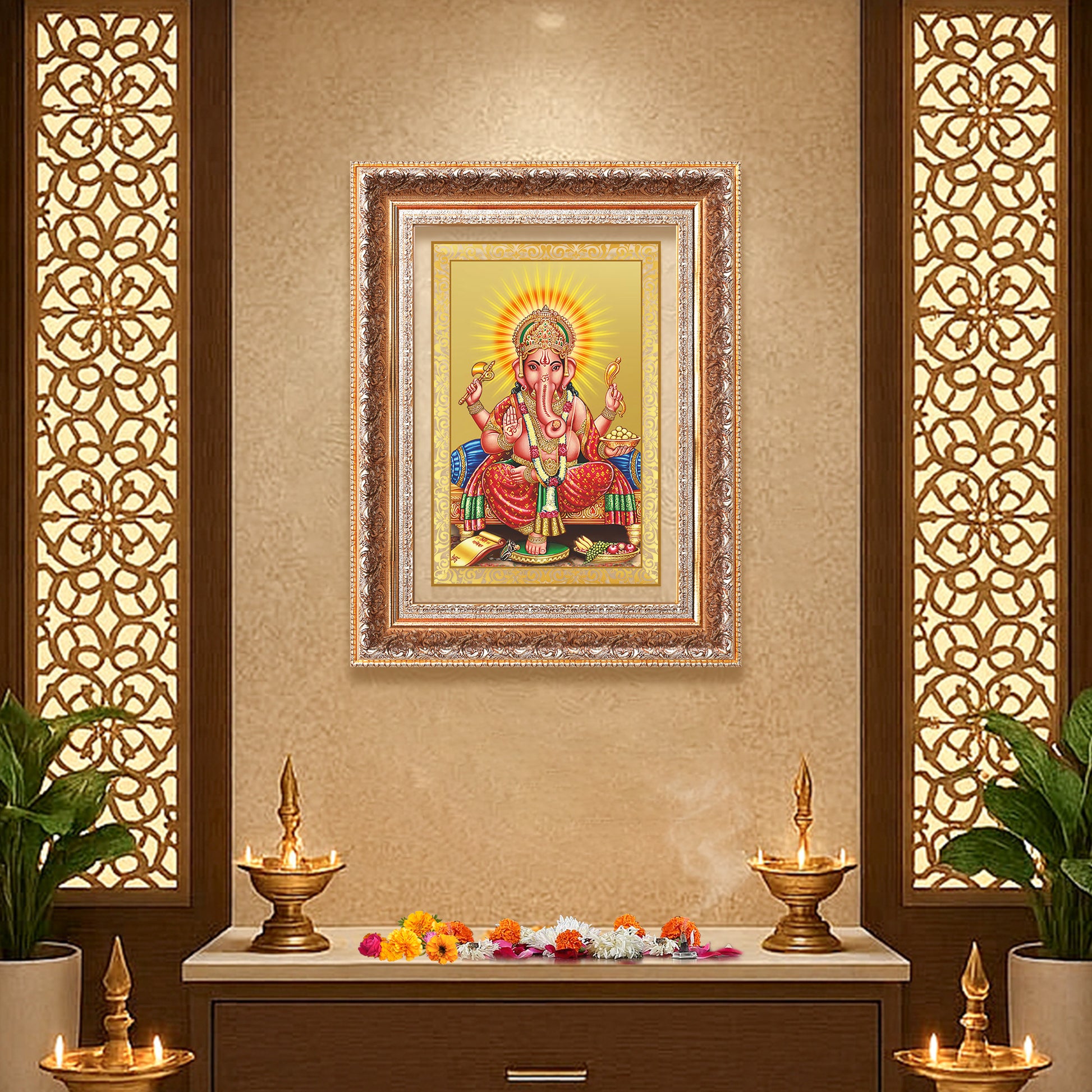 Invoke the divine presence of Lord Ganesha, the remover of obstacles and the god of wisdom and auspicious beginnings, with this beautifully crafted Wall Mount Photo Frame in 24K gold-plated foil. Revered as Vighnaharta and the harbinger of prosperity, Lord Ganpati’s blessings are invoked at the start of every sacred occasion and new venture.