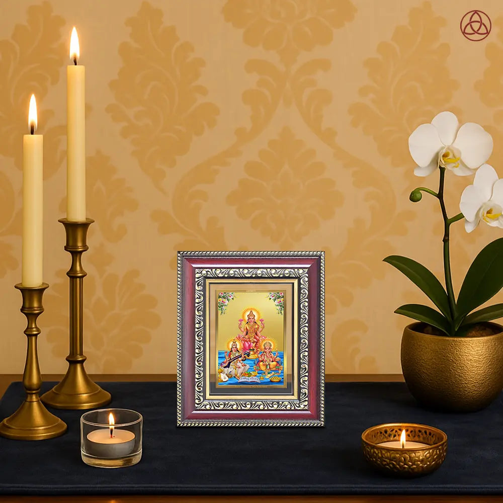 Celebrate the union of wisdom, wealth, and auspiciousness with this sacred depiction of Goddess Lakshmi, Goddess Saraswati, and Lord Ganesha, beautifully crafted in 24K gold-plated foil. This divine trio is traditionally worshipped together to invoke prosperity, intellect, and success in all spheres of life material, spiritual, and creative.