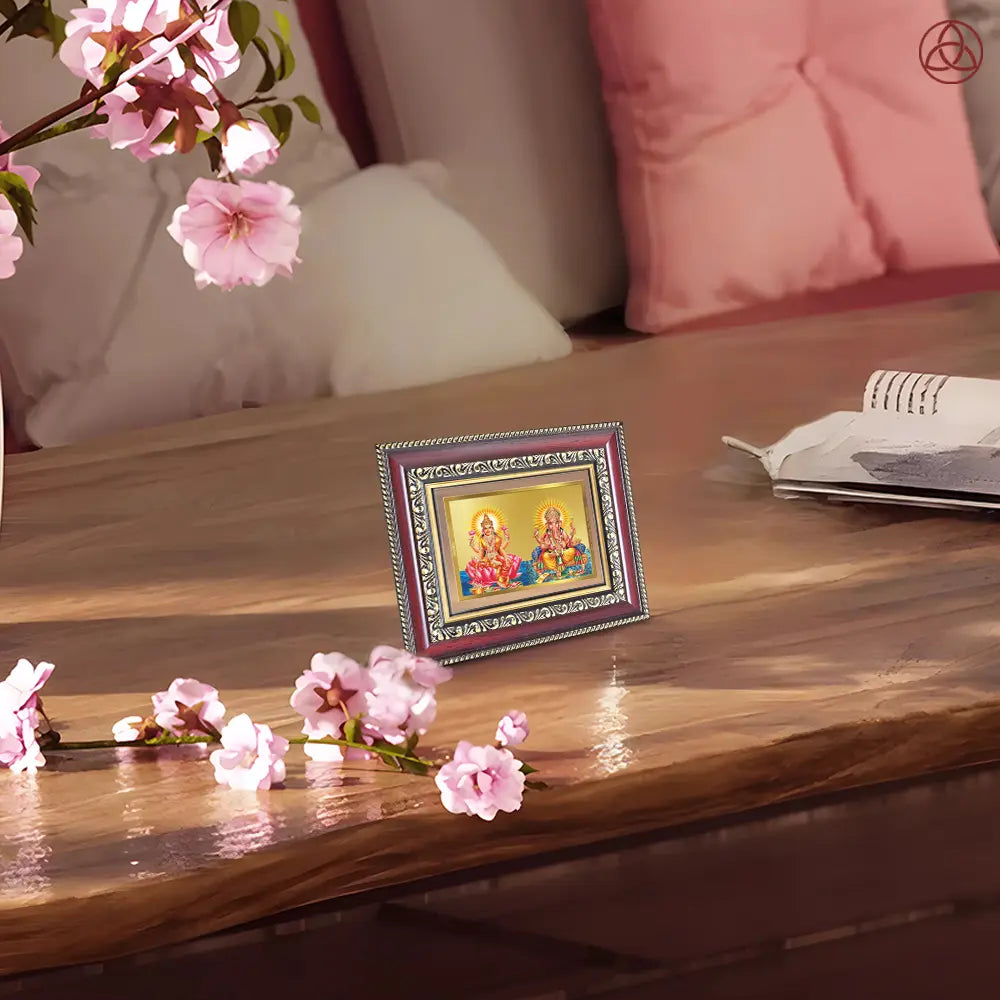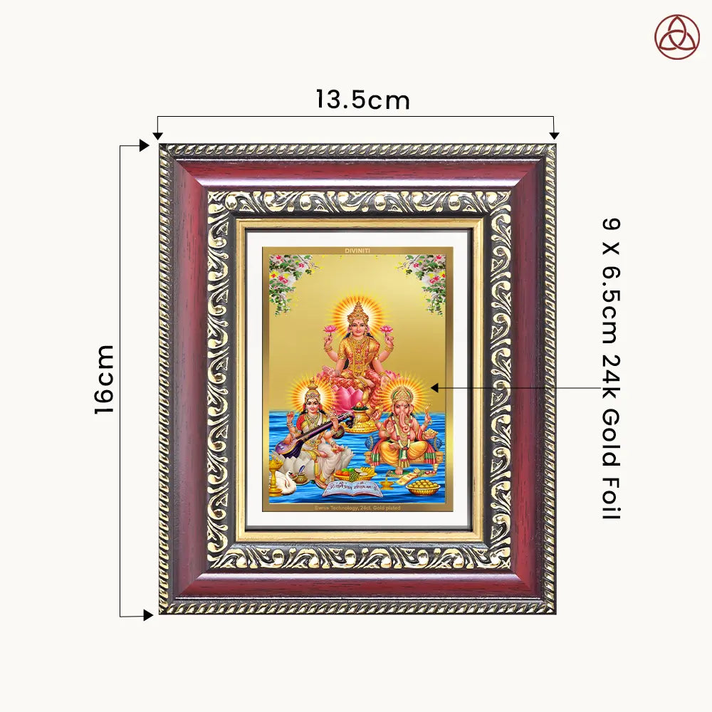 Goddess Lakshmi, the bestower of wealth and abundance; Goddess Saraswati, the embodiment of knowledge and the arts; and Lord Ganesha, the remover of obstacles and lord of new beginnings come together in this radiant frame to bless your home and heart. Crafted with Swiss embossing technology for intricate precision and a rich gold finish, this frame is a symbol of perfect harmony and grace. The 24K gold plating ensures enduring brilliance, making it ideal for pooja rooms, workspaces, or as a cherished gift for new ventures and festive occasions.