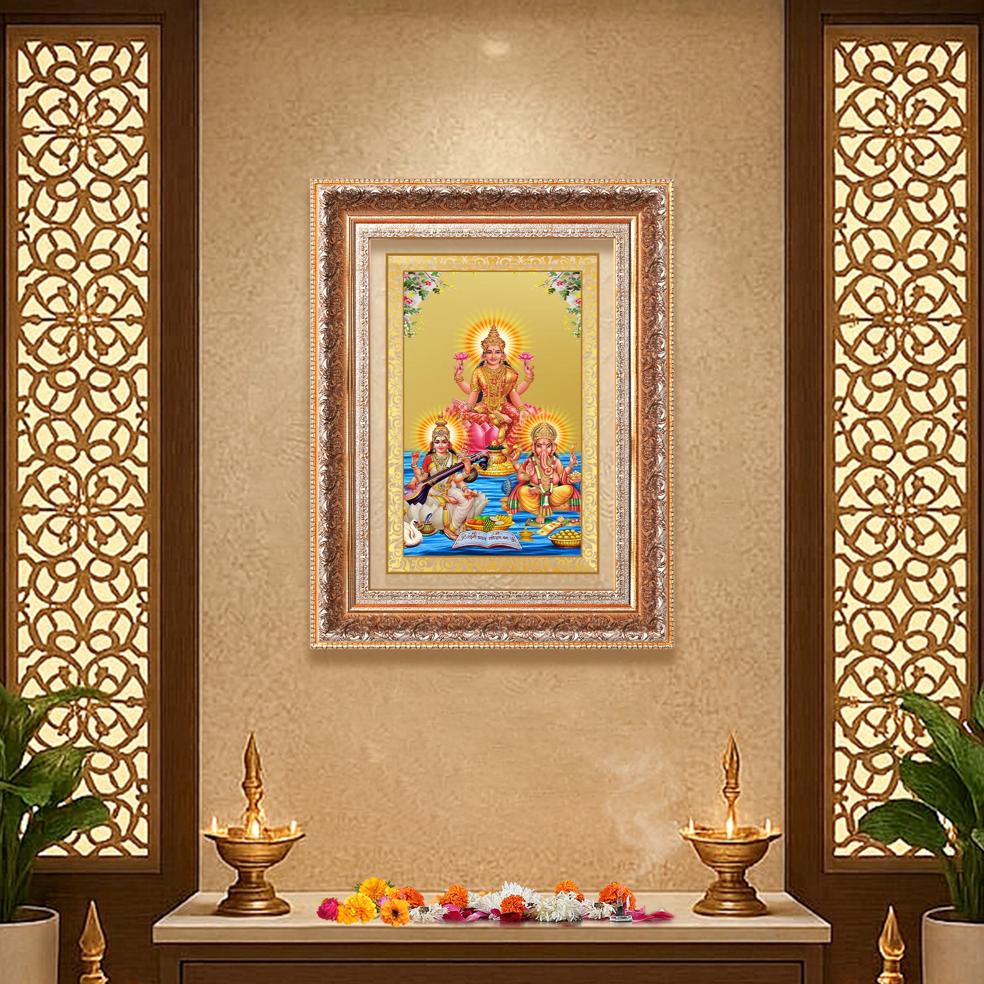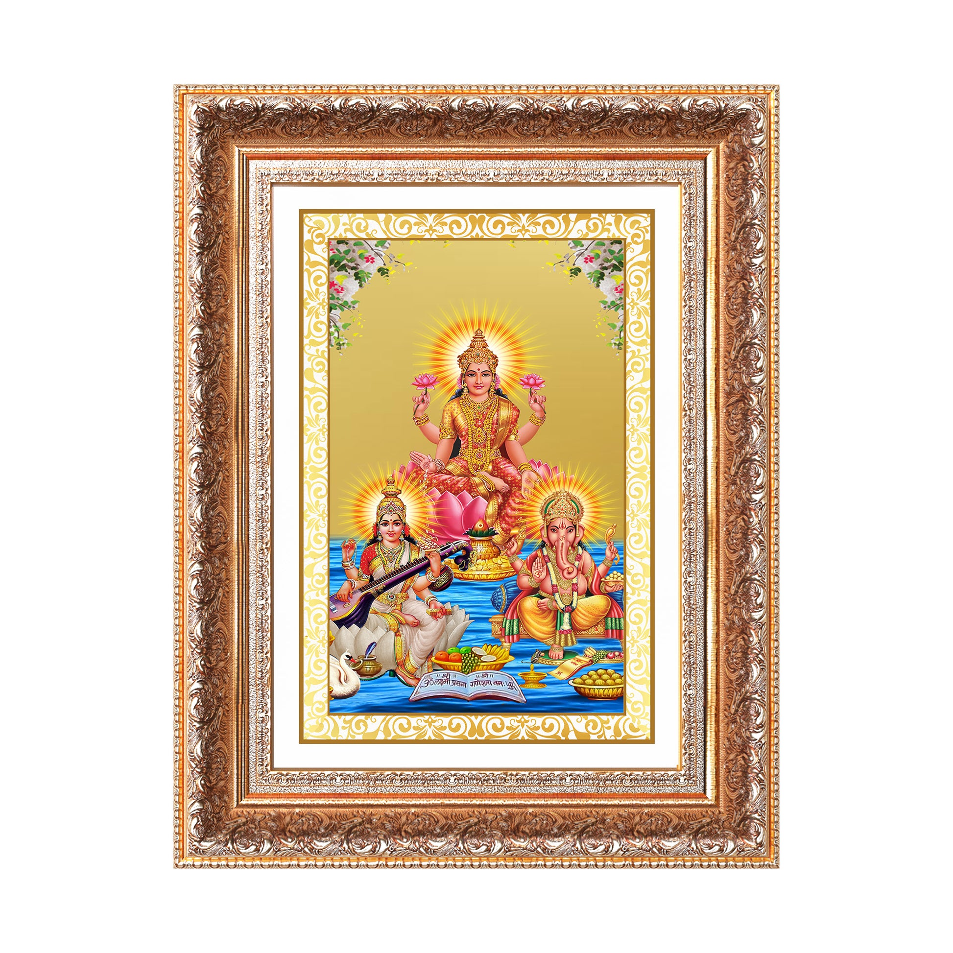 Celebrate the union of wisdom, wealth, and auspiciousness with this sacred depiction of Goddess Lakshmi, Goddess Saraswati, and Lord Ganesha, beautifully crafted in 24K gold-plated foil. This divine trio is traditionally worshipped together to invoke prosperity, intellect, and success in all spheres of life material, spiritual, and creative.