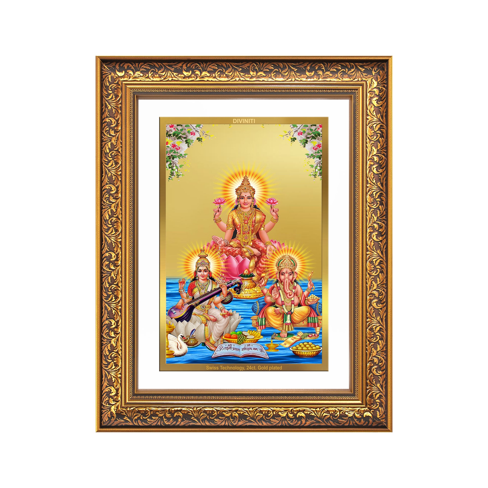 Goddess Lakshmi, Saraswati & Lord Ganesha | Divine Trio Wall Mount Photo Frame in 24K Gold Plated Foil