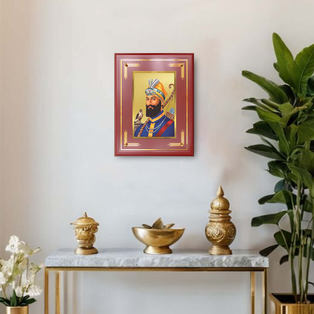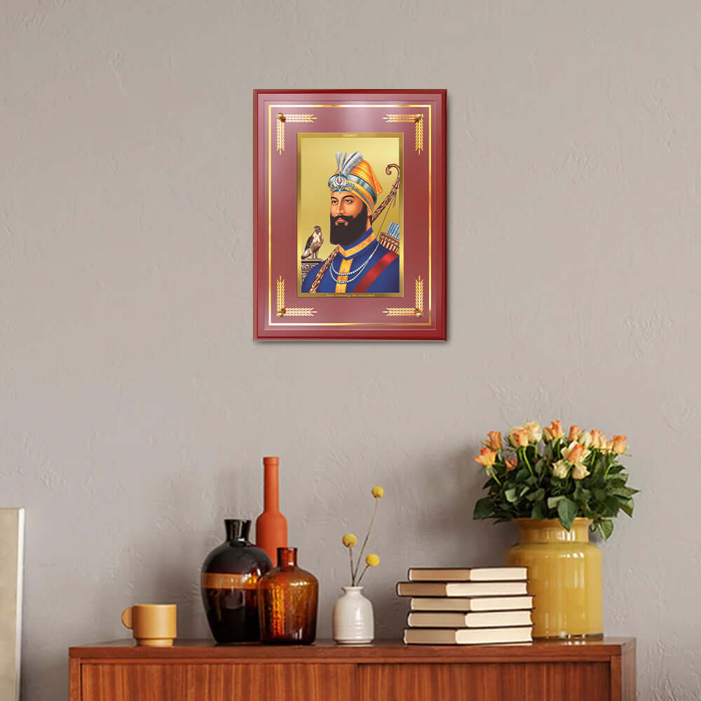 Bring home the majestic presence of Guru Gobind Singh Ji with this divine 24K gold-plated foil Wall and Tabletop Photo Frame. The tenth Guru of Sikhism, Guru Gobind Singh Ji is revered as a spiritual warrior, poet, and saint who founded the Khalsa Panth and upheld righteousness, courage, and devotion to Waheguru. This inspiring artwork features Guru Sahib Ji in regal attire, radiating strength, wisdom, and grace — often depicted with a falcon, sword, and calm yet commanding expression. His image symbolizes fearless leadership, spiritual discipline, and sacrifice for dharma.