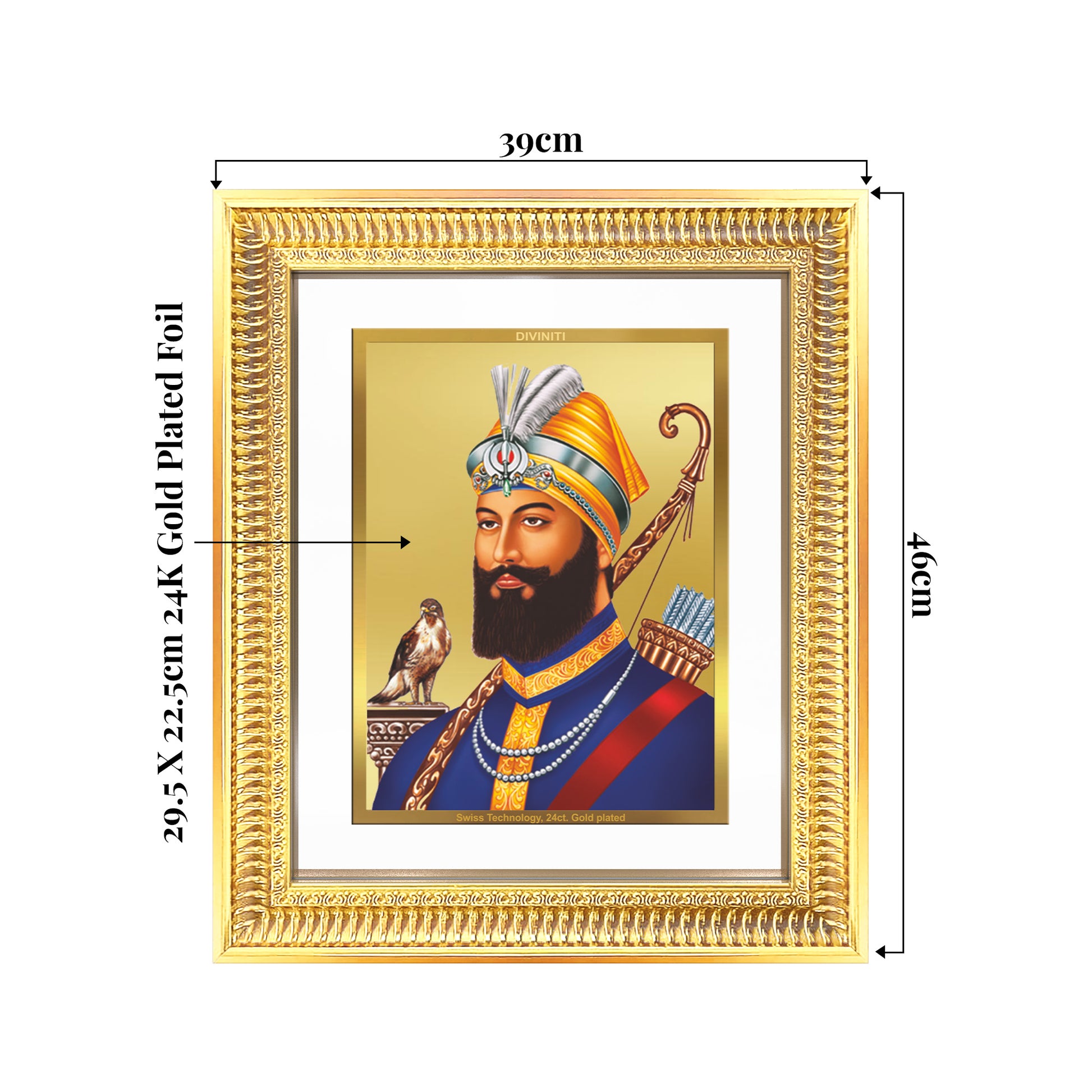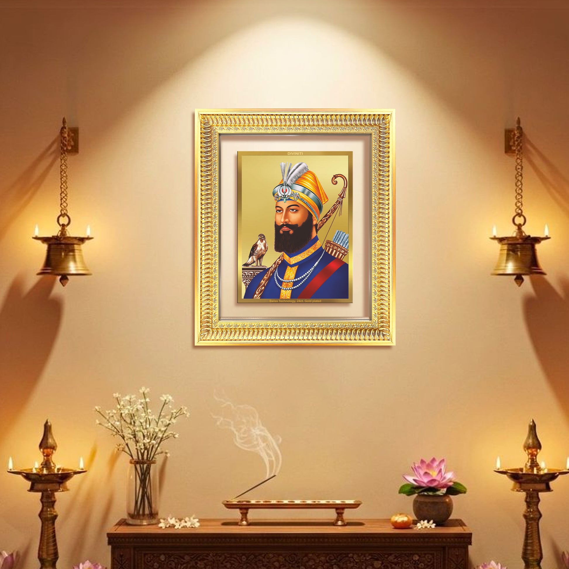 Expertly crafted using Swiss embossing technology, this photo frame showcases intricate detailing and divine elegance, highlighted in brilliant 24K gold plating. A perfect centerpiece for your pooja room, study, or sacred space, it invokes divine strength, selfless service, and unwavering faith inspired by Guru Gobind Singh Ji’s teachings.