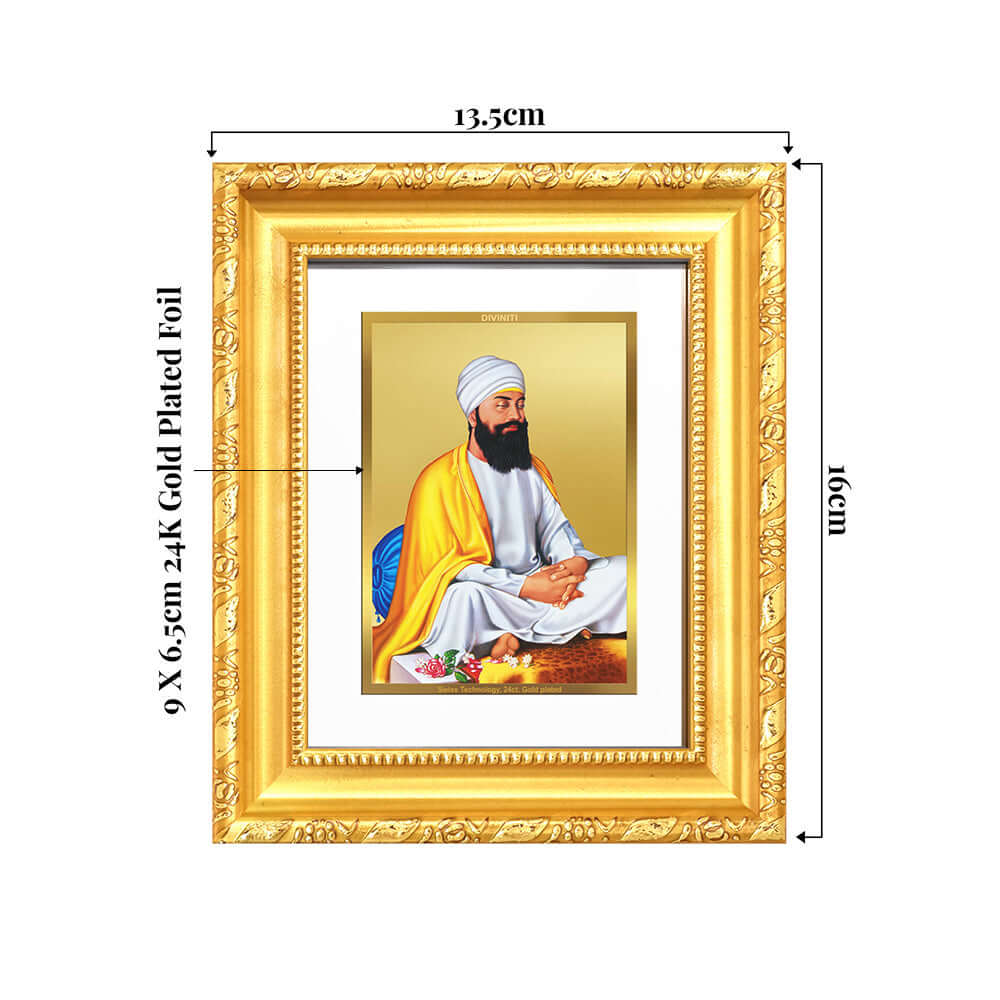 Honor courage, sacrifice, and unwavering faith with this elegant Guru Tegh Bahadur Sahib Ji frame, reverently depicting the ninth Sikh Guru known for his supreme sacrifice to protect religious freedom and humanity. Symbolizing bravery, spiritual strength, and moral righteousness, Guru Tegh Bahadur Sahib Ji inspires devotion and resilience in all who follow his teachings. Expertly crafted in 24K gold plated foil, this sacred frame reflects refined artistry and timeless reverence. Ideal for home prayer spaces, office desks, study areas, or displays, it brings blessings, inspiration, and a profound sense of faith to every space it adorns.