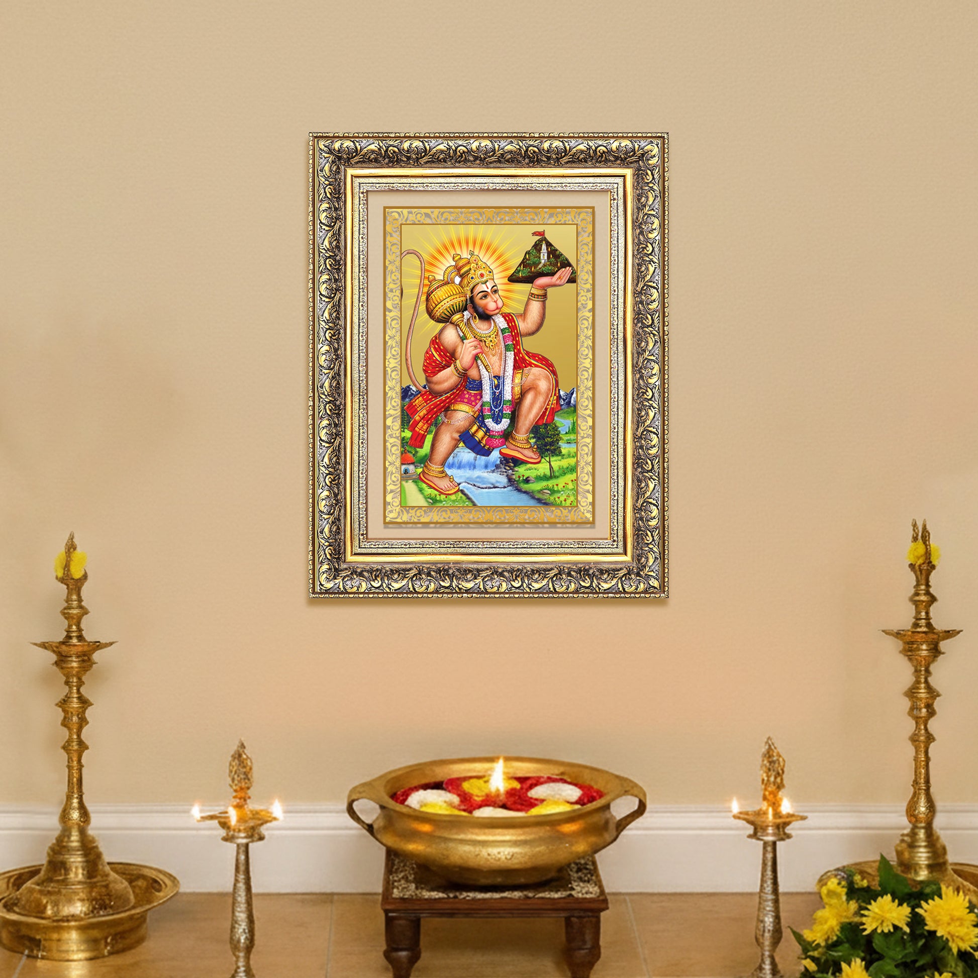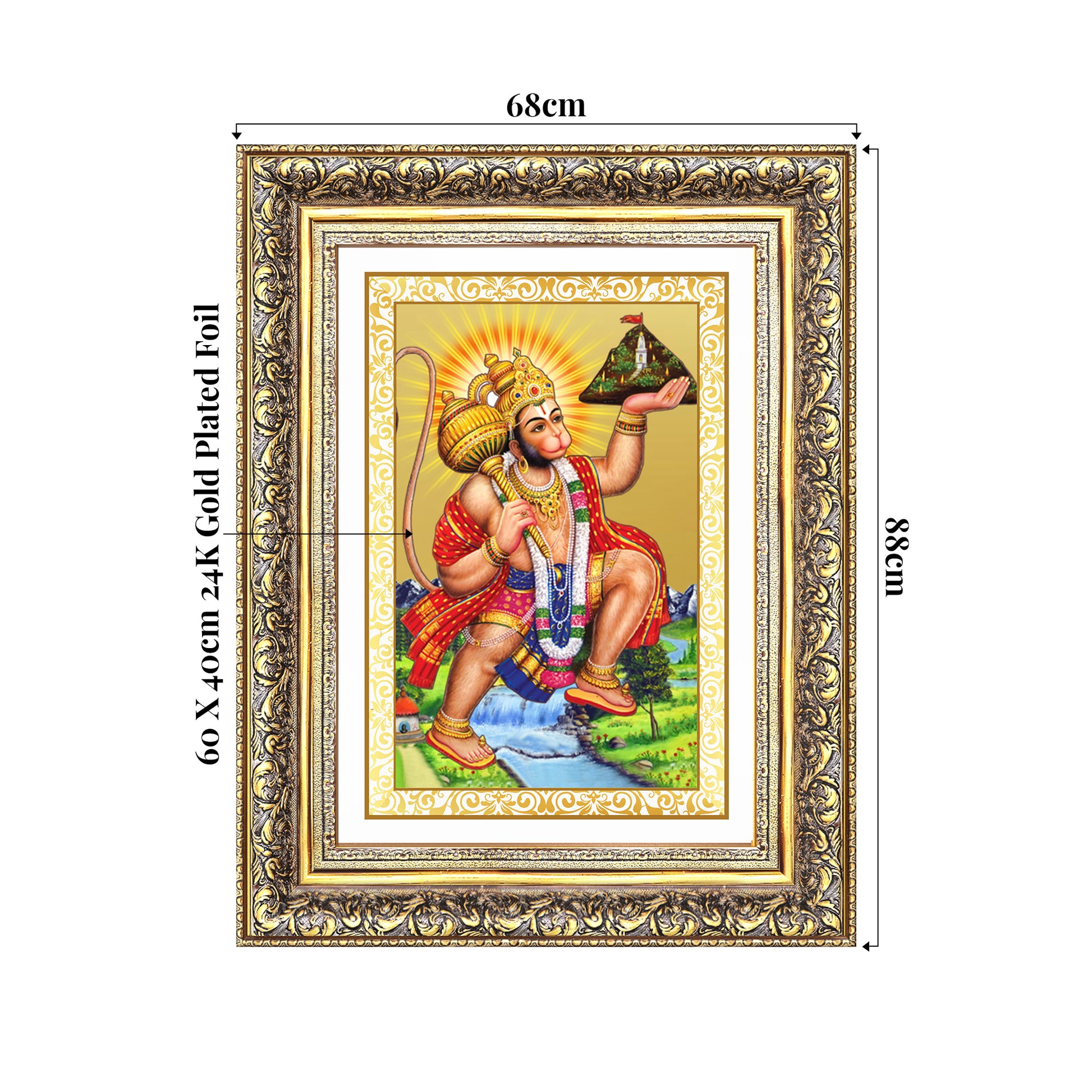 Crafted with precision using advanced Swiss embossing technology, the Photo Frame captures every intricate detail from Hanuman's dynamic posture to the majestic mountain held high in the sky. The radiant 24K gold finish ensures timeless brilliance and reverence. A perfect spiritual centrepiece for your pooja room, home, or office, this sacred Photo Frame invites strength, determination, and divine protection into your life.