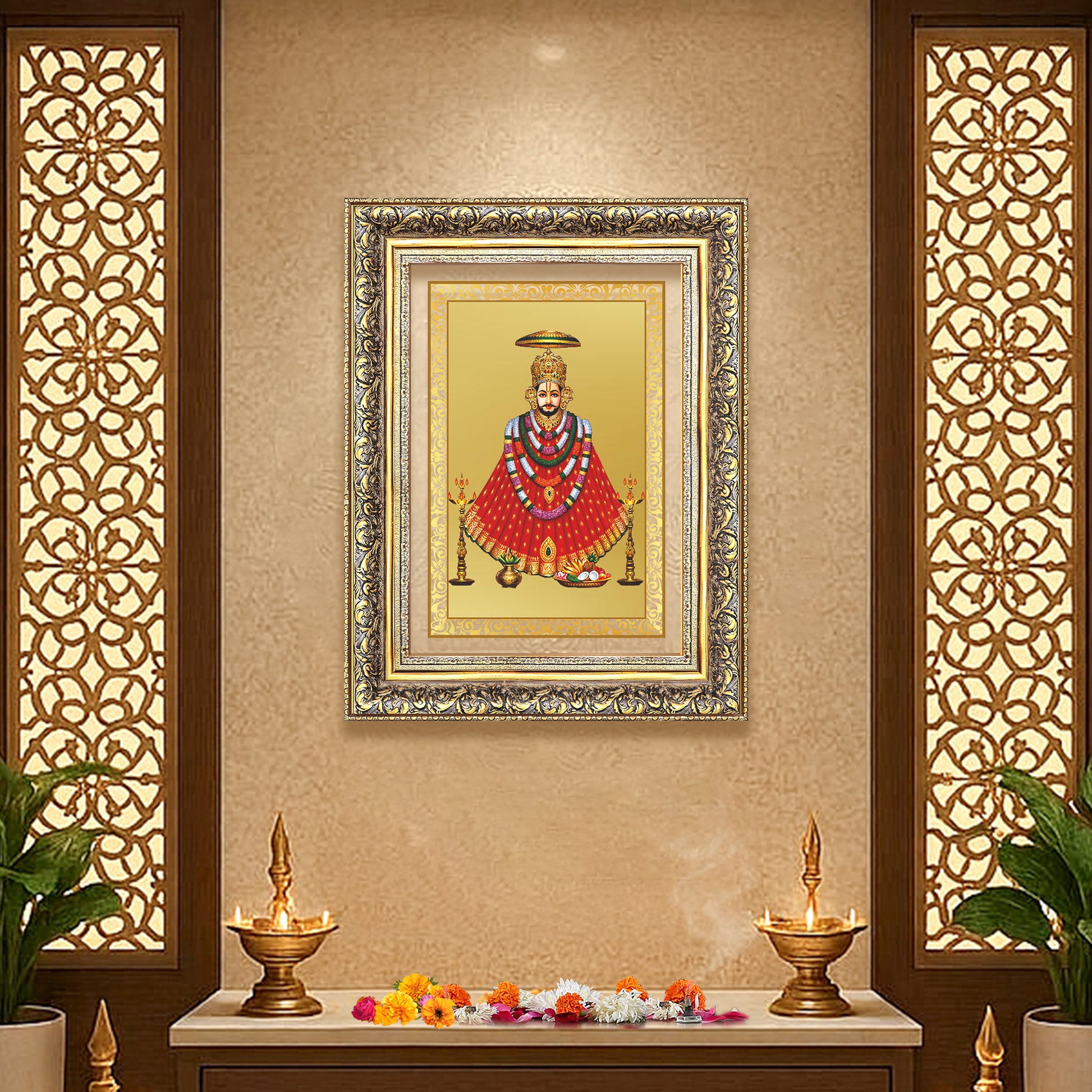 Invoke the boundless compassion and divine blessings of Khatu Shyam Ji, the revered manifestation of Barbarik and the crown jewel of devotion, with this exquisite 24K gold-plated foil Wall Mount Photo Frame. Worshipped as the giver of boons and the fulfiller of wishes, Khatu Shyam Ji is known for his promise to protect devotees in the age of Kali Yuga.