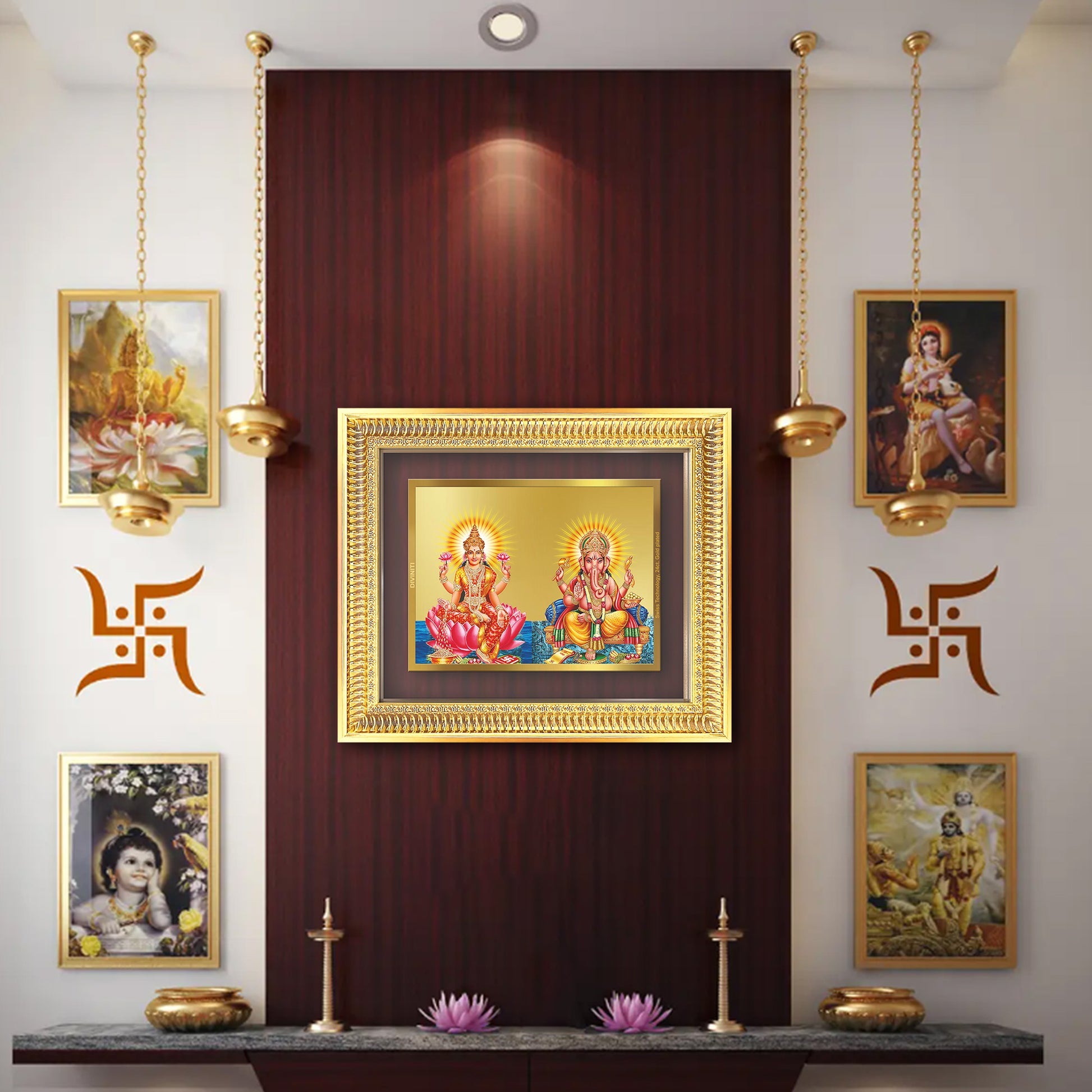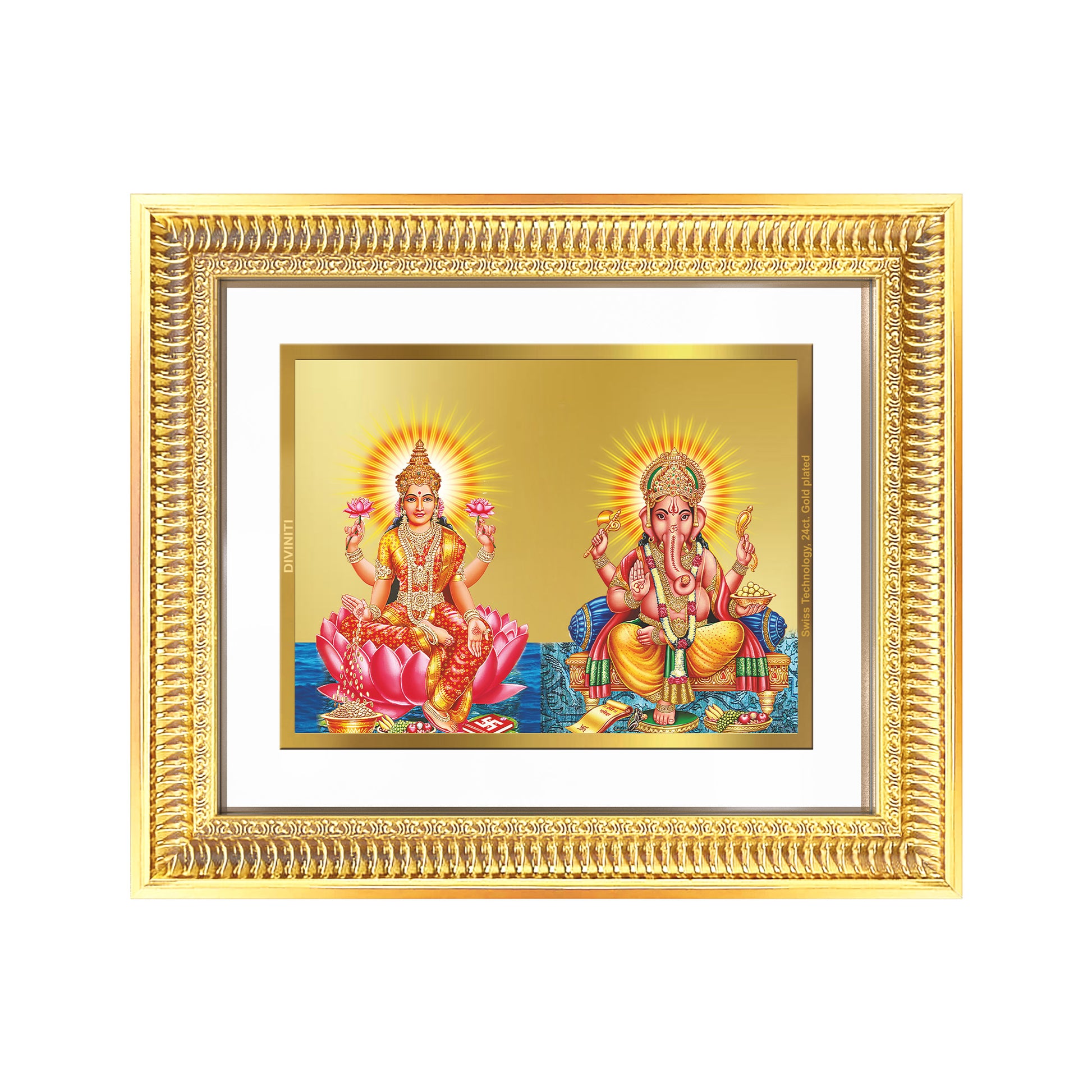 This exquisite Photo Frame features Goddess Lakshmi seated on a lotus, bestowing wealth and fortune, alongside Lord Ganesha in his benevolent form as the remover of obstacles and harbinger of auspiciousness. Crafted using advanced Swiss embossing technology, every intricate detail shines with divine precision and brilliance. The radiant 24K gold finish ensures timeless elegance, making it ideal for your pooja room, office, or as a thoughtful gift to bless new ventures, homes, or festive celebrations.