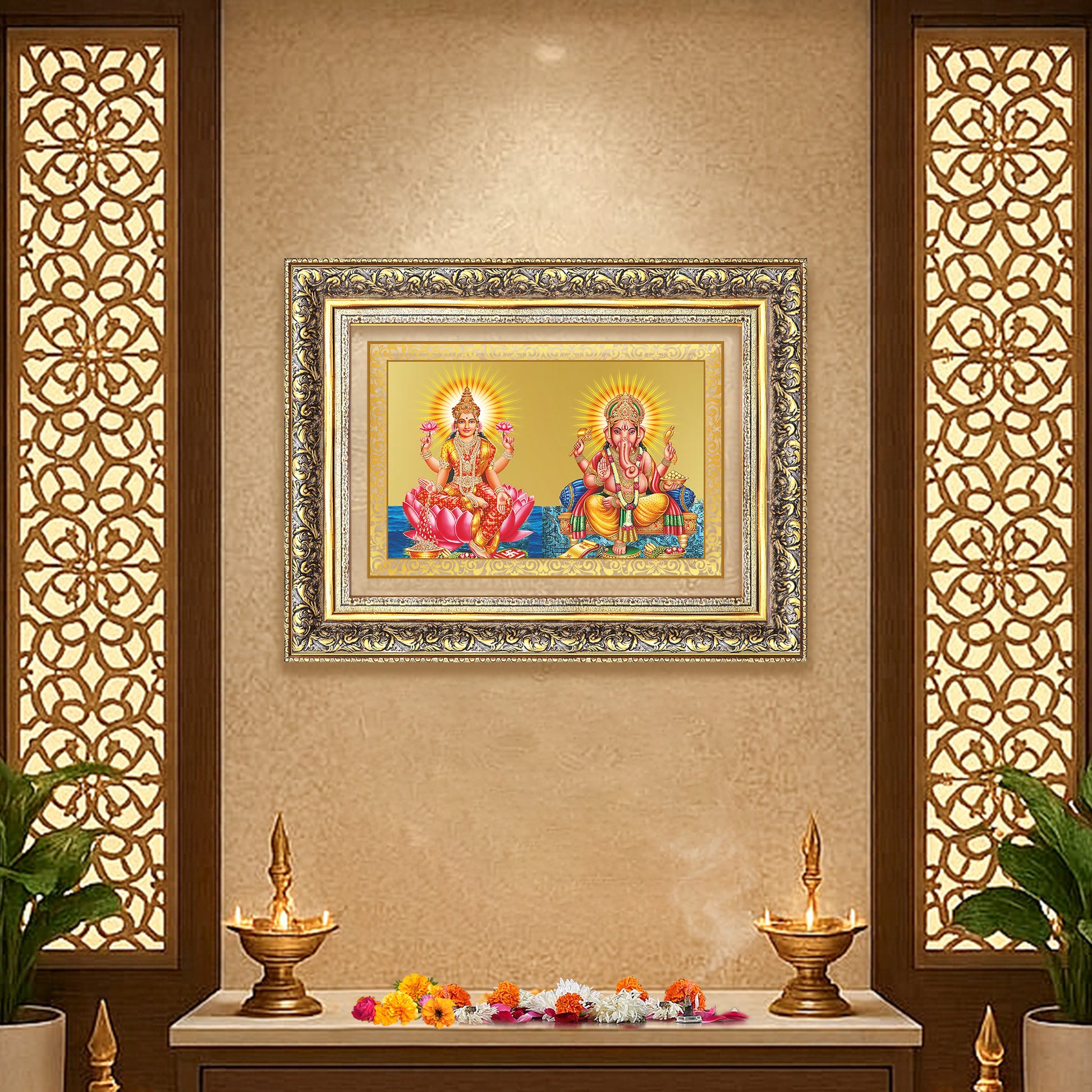 This exquisite Photo Frame features Goddess Lakshmi seated on a lotus, bestowing wealth and fortune, alongside Lord Ganesha in his benevolent form as the remover of obstacles and harbinger of auspiciousness. Crafted using advanced Swiss embossing technology, every intricate detail shines with divine precision and brilliance. The radiant 24K gold finish ensures timeless elegance, making it ideal for your pooja room, office, or as a thoughtful gift to bless new ventures, homes, or festive celebrations.