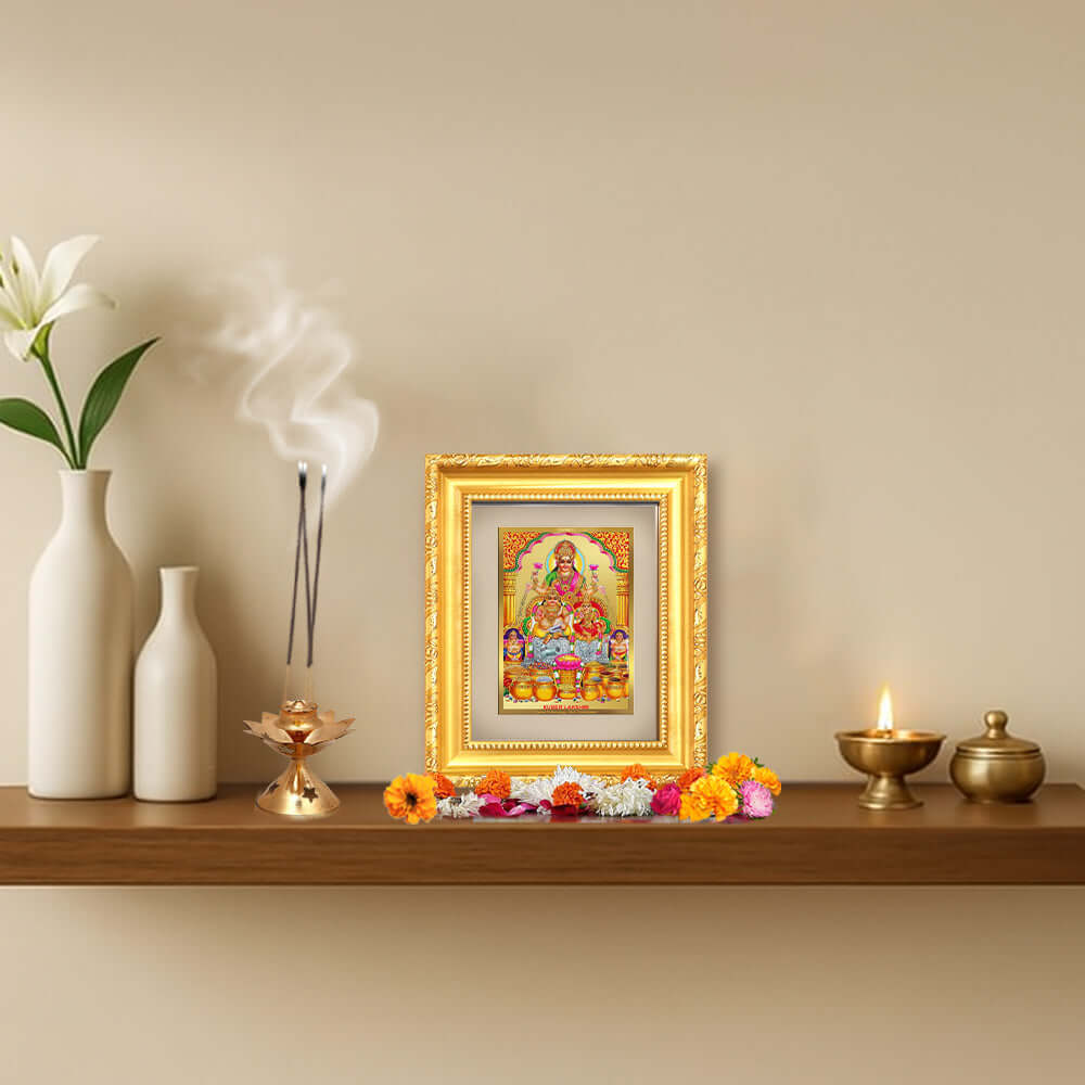 Invite the combined blessings of Goddess Lakshmi and Lord Kuber, the divine custodians of wealth and fortune, with this exquisitely crafted Tabletop Frame in 24K gold plated foil. Worshipped together for attracting prosperity, financial stability, and abundance, Lakshmi and Kuber represent the perfect union of divine grace and material success.