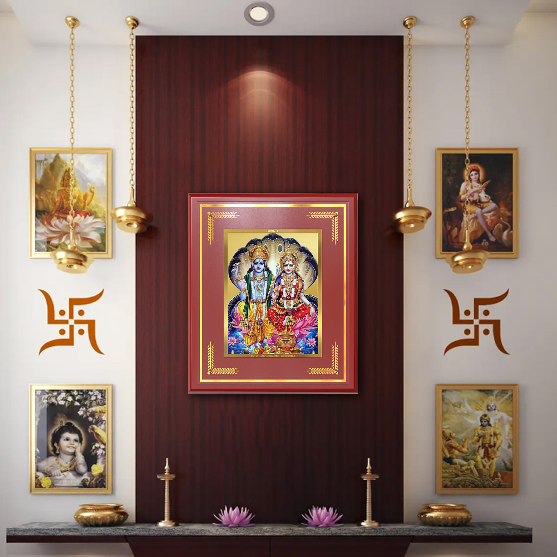 Embrace divine harmony and cosmic balance with this sacred depiction of Lakshmi Vishnu, beautifully rendered in 24K gold-plated foil. Representing the union of Lord Vishnu, the preserver of the universe, and Goddess Lakshmi, the goddess of wealth and prosperity, this divine pair blesses devotees with abundance, stability, and spiritual upliftment.